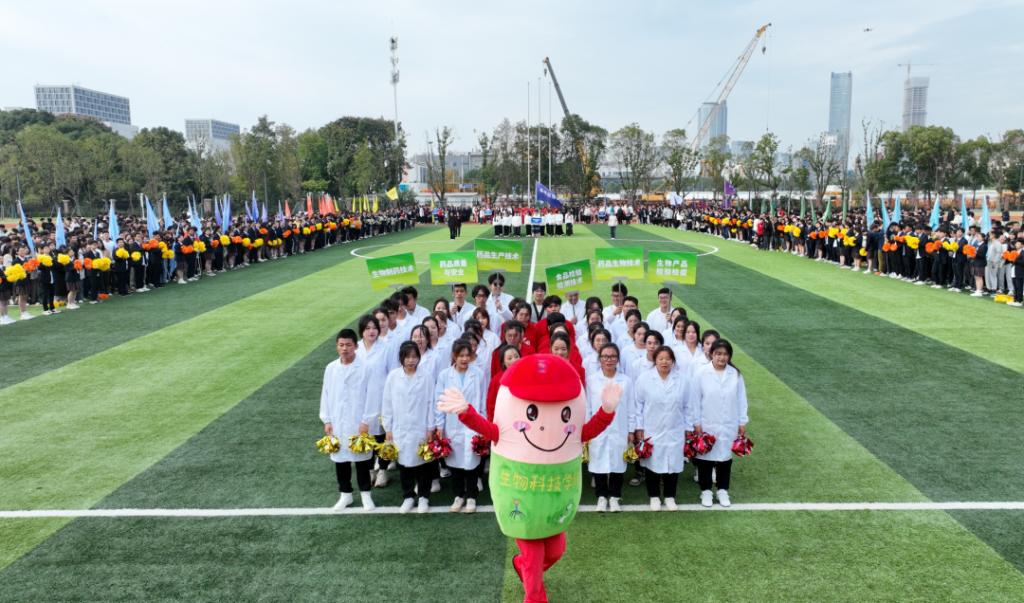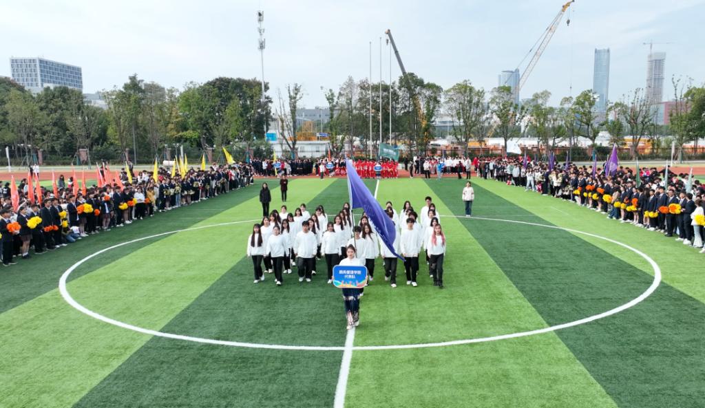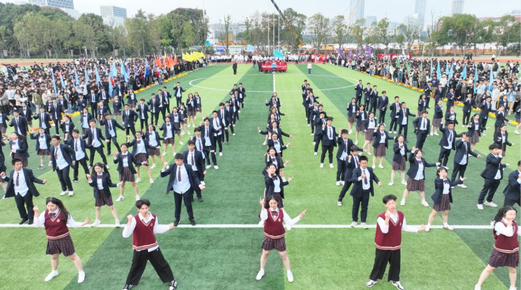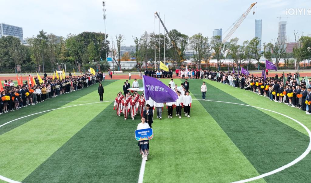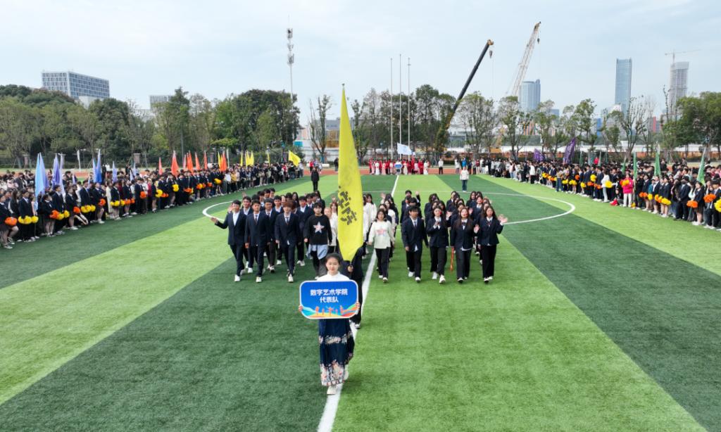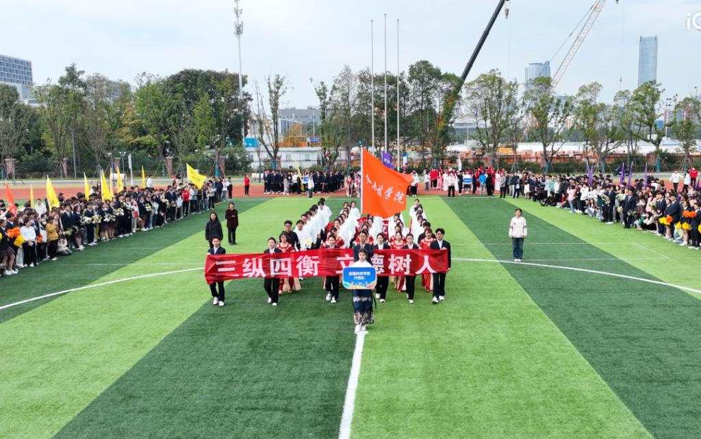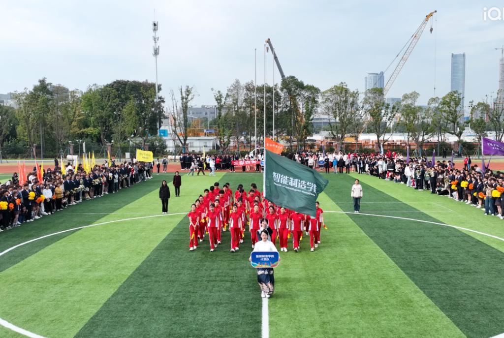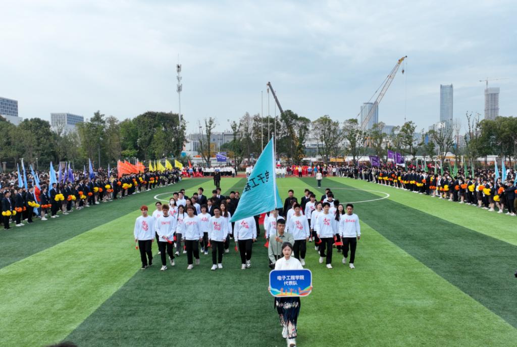 入场式在活力四射的百人团体操表演《超燃少年》中拉开帷幕。激昂青春的旋律、整齐划一的队列、矫健有力的身姿,不时赢得全场阵阵掌声。接着,教工代表队、八大学院及国际学院代表方阵分别用各具特色的形式步入场地,将现场氛围推向了高潮。从传统的舞龙表演、炫酷的航模展示、铿锵有力的扇舞到创意满满、承载着美好憧憬的学院吉祥物精彩亮相……师生们用精彩纷呈的舞步、歌声和口号展现了昂扬向上、追求卓越、朝气蓬勃的精神面貌。