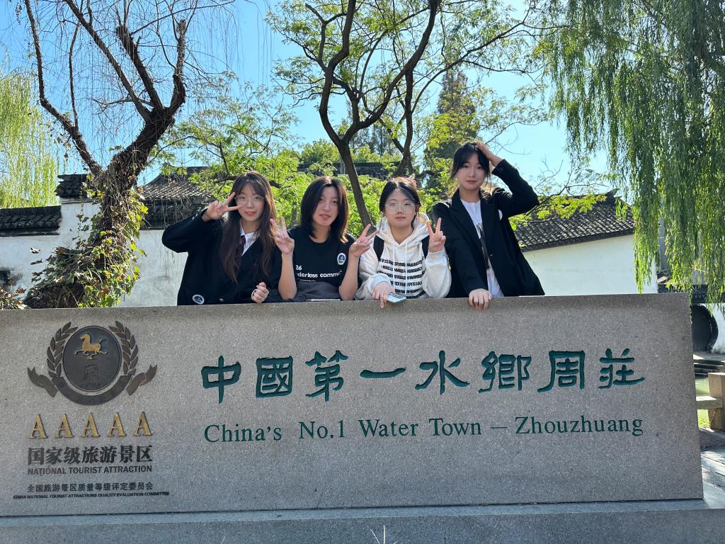 悠悠的水,曲曲的河,弯弯的桥,窄窄的街,深深的巷,粉粉的墙。同学们踏着石板街,踩着小石桥,追寻着记忆里的似水华年,追寻着历史上的兴衰荣辱,追寻着文学中的水乡如诗如画;双桥前留个影,怪楼里闯个关,沈厅里摸摸聚宝盆,张厅里看看古字画。周庄古镇秀丽的水乡风光,深厚的历史文化底蕴,感染着每一位师生。