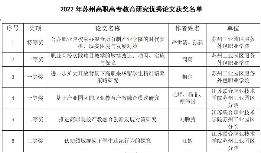 本次优秀论文评选由苏州市教育局组织开展,苏州高职高专院校联席会议“产教联盟”组织专家评审,最终评出特等奖10篇、一等奖20篇、二等奖30篇。