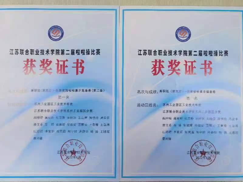 在今年6月的2022年江苏省职业学校第十三届啦啦操比赛暨江苏联合职业技术学院第二届啦啦操比赛中,我校“善水灵动”啦啦操队继去年获得团体一等奖之后,在本次比赛中再次获得2项第一名及团体一等奖。