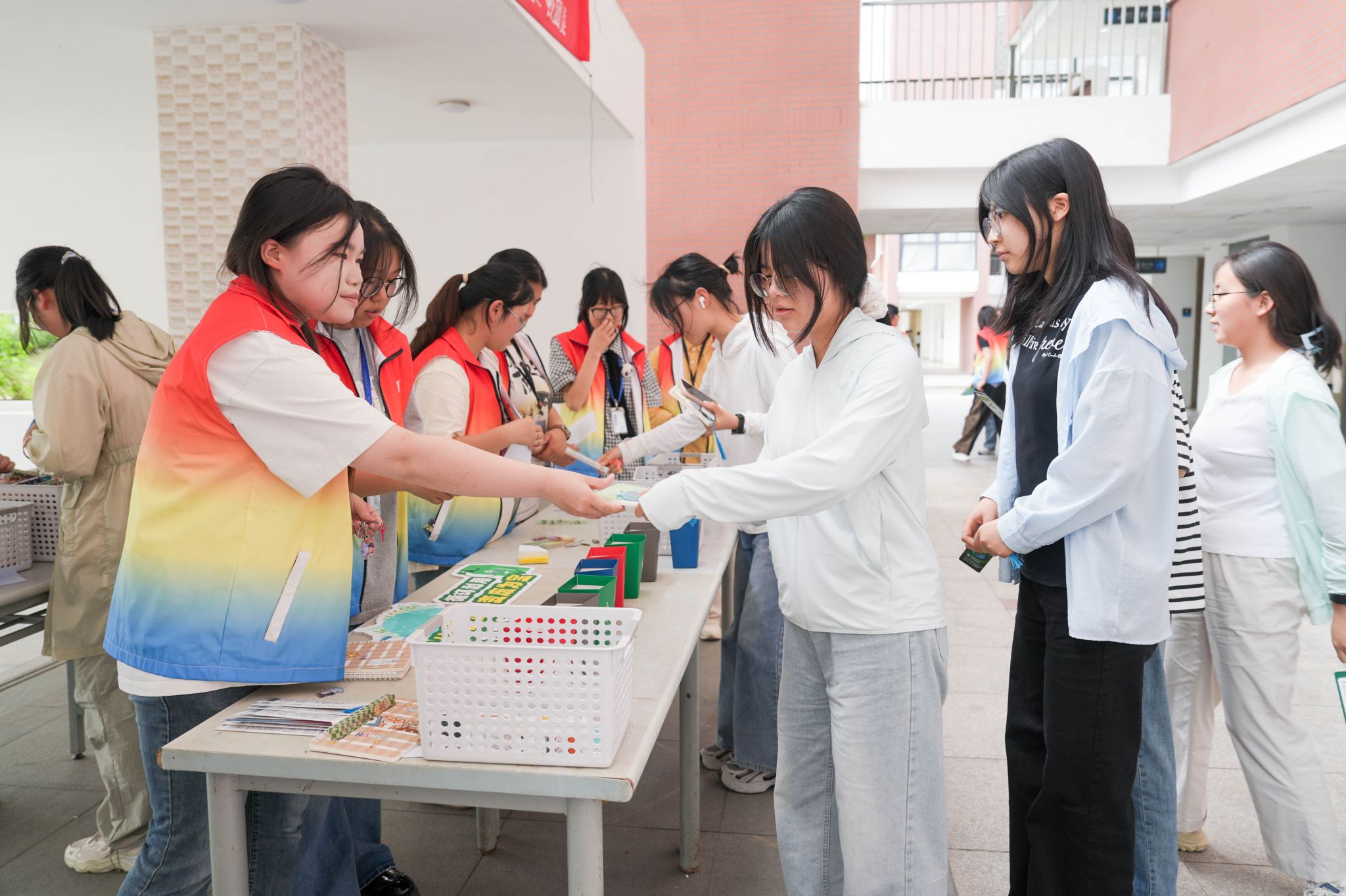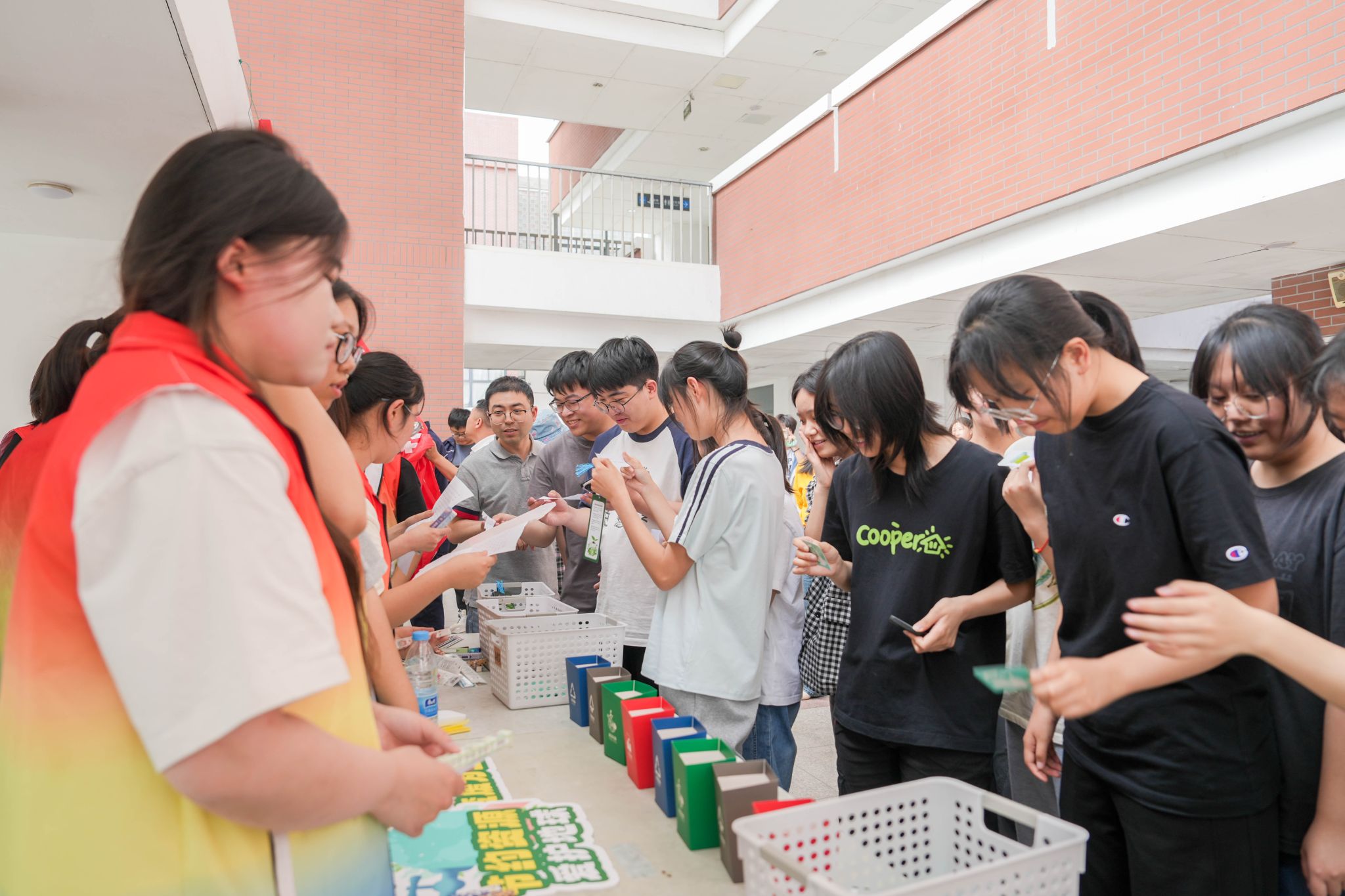 当日15:00-16:00,善信楼一楼西走廊变身“环保课堂”,“垃圾分类大挑战”“环保节能知识问答”等互动游戏摊位吸引数百名师生驻足。活动现场,参与者通过模拟垃圾分类卡片投放、抢答环保知识题目等形式,在趣味体验中学习可回收物、有害垃圾等分类标准及校园节能技巧。工作人员结合校园日常垃圾处理场景,以通俗易懂的语言讲解塑料污染危害及减塑措施,引导师生从“随手扔”向“随手分”转变,将绿色生活理念融入日常。