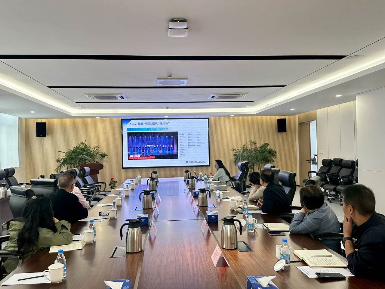 会议交流阶段,陈群对集团发展情况进行全面介绍,并明确此次来校调研的三大核心目的。一是“取经学习”,深入了解我校在专业建设、产教融合实践及融媒体运作方面的先进经验与创新做法,为集团后续工作开展提供参考;二是“协同合作”,希望与我校在融媒体运作领域建立深度合作关系,依托双方资源优势,共同探索融媒体人才培养新模式、新路径;三是“倾听诉求”,广泛听取我校在参与集团建设、开展校企合作过程中的需求与建议,进一步优化集团服务机制,推动集团与成员单位协同发展。