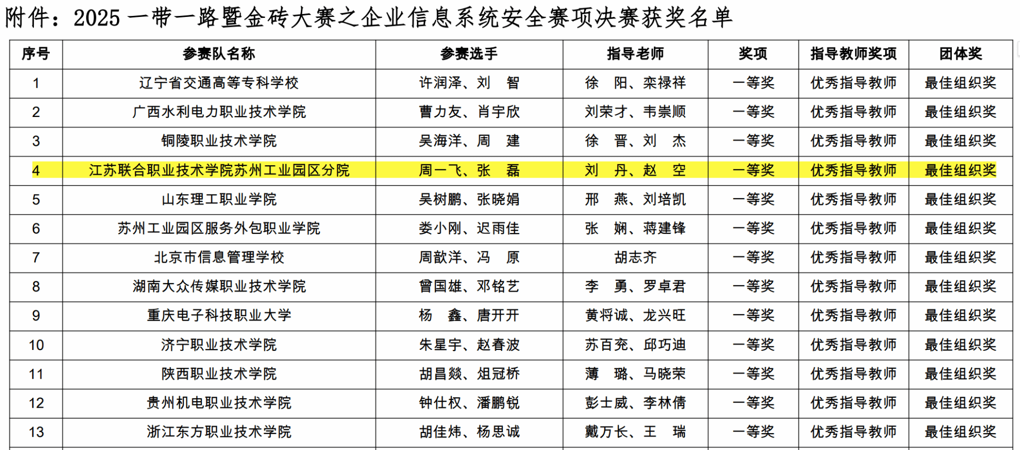 近日,2025一带一路暨金砖国家技能发展与技术创新大赛之第三届企业信息系统安全赛项国赛在山东理工职业学院圆满落幕。全国112所高校参赛队伍同台竞技,我校数字艺术学院22计算机应用技术高职班周一飞、张磊同学在刘丹、赵空老师指导下,以全国第4名的优异成绩荣获一等奖,两位指导教师获评"优秀指导教师",学校同时获授"最佳组织奖"。此次突破性成果彰显了学校在网络安全人才培养领域的卓越成效。