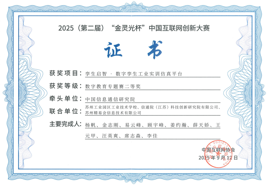 近期,中国互联网协会主办的第二届“金灵光杯”中国互联网创新大赛获奖名单正式揭晓。杨帆、金志刚、易云峰、顾宇峰等主要完成人共同研发的“孪生启智·数字孪生工业实训仿真平台”项目,荣获“数字教育专题赛二等奖”。该项目由中国信息通信研究院牵头,携手苏州工业园区工业技术学校,联合信通院(江苏)科技创新研究院有限公司、苏州精易会信息技术有限公司等单位共同完成。