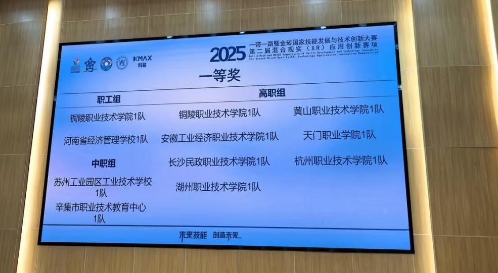 11月21日至23日,2025一带一路暨金砖国家技能发展与技术创新大赛第二届混合现实(XR)应用创新赛项全国总决赛在铜陵职业技术学院圆满落幕。在学校与学院全方位的支持下,指导教师毛辉、武佳佳、章虹全身心投入备赛工作,带领23级动漫制作技术专业学生姚苏钥、王芯怡刻苦钻研技术要点、反复打磨参赛作品,最终凭借扎实的专业功底、创新的设计理念与高效的团队协作,从全国众多参赛队伍中脱颖而出,荣获该赛项中职组一等奖第一名的优异成绩。