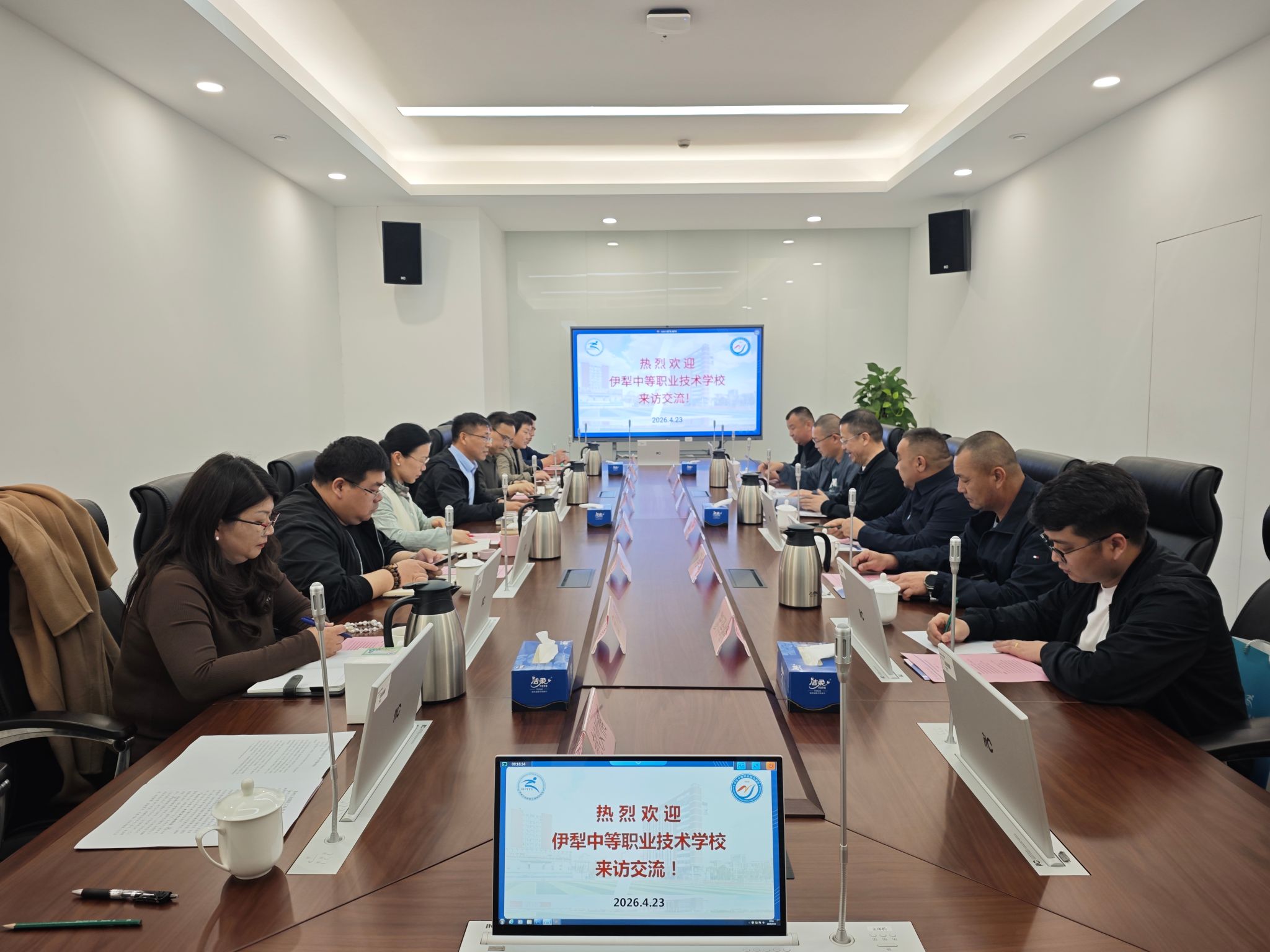赵泰峰对我校的热情接待表示感谢,对我校办学理念、建设成效与育人体系给予高度评价,并介绍了伊犁中等职业技术学校办学概况、专业特色与育人实践。双方围绕专业群建设、模块化课程体系构建、“双师型”教师培养、学生管理创新、校企合作深化等关键议题深入研讨,分享了各自的办学经验与创新做法,为后续精准对接、务实合作奠定坚实基础。