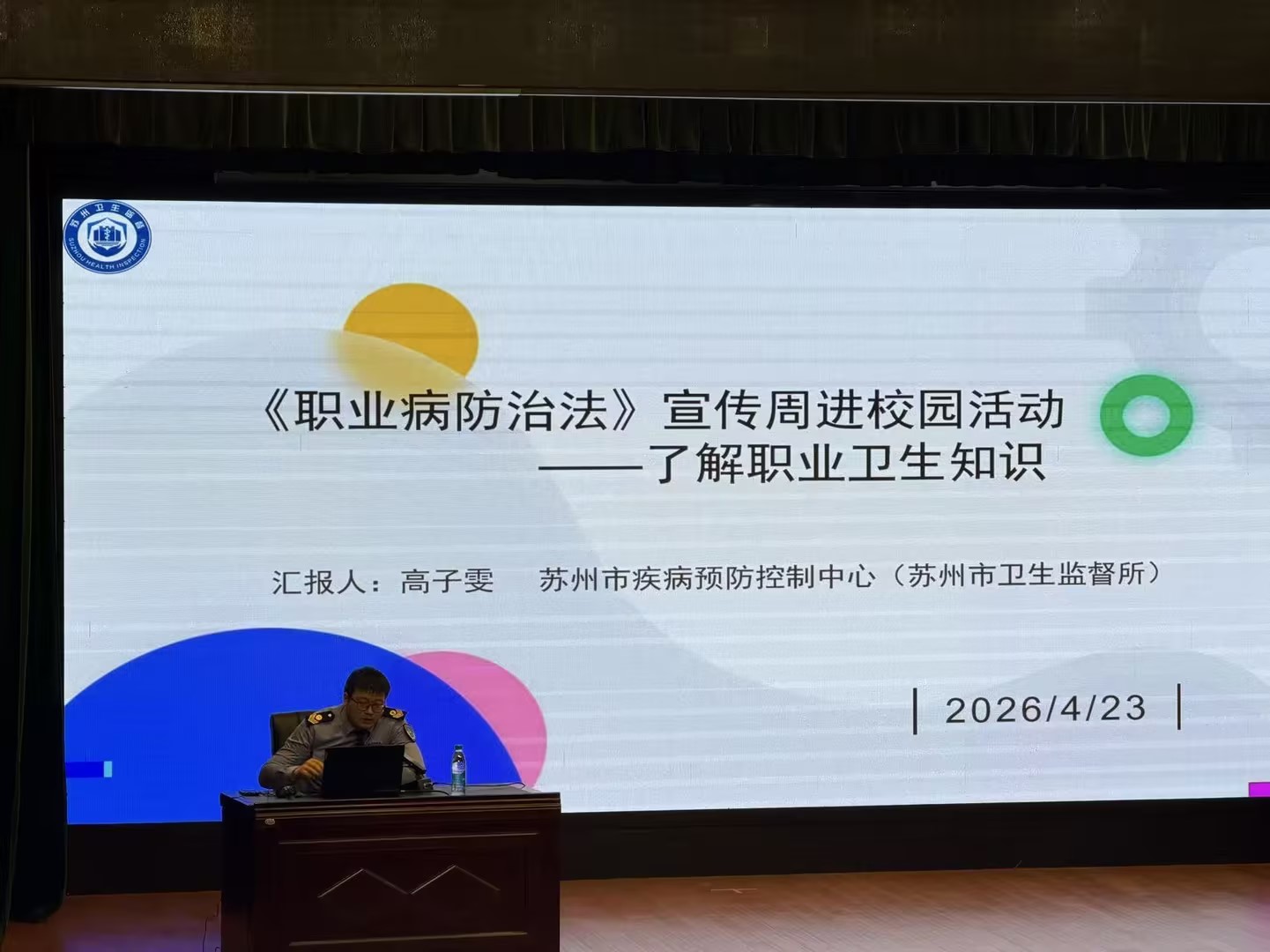 为深入落实第24个《职业病防治法》宣传周活动要求,进一步普及职业卫生知识,提升青少年职业危害认知与防护能力,4月23日下午,我校后勤处特邀苏州市疾病预防控制中心、苏州工业园区疾病预防控制中心职业病防治专家走进校园,开展以“守护职业健康,共建健康中国”为主题的专题讲座,为在校学子送上了一堂实用生动的“职业健康第一课”。