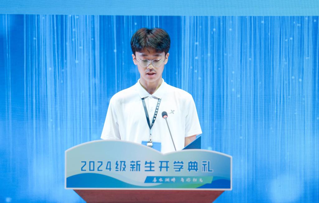 在悠扬动听的校歌《善水湖畔》旋律中,开学典礼缓缓拉开序幕。2024旅游管理高职1班孙朔垒作为新生代表发言,他号召同学们要心存梦想,要有刻苦学习的拼劲、坚定不移的信心,他立志不负青春韶华,努力提升自己的综合素质,做一名全面发展的学生。