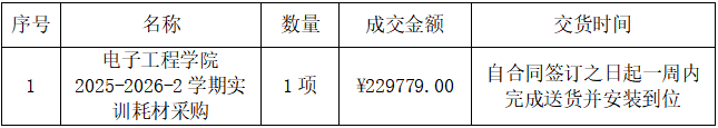 苏州诚联招投标咨询服务有限公司受苏州工业园区工业技术学校的委托,就其拟采购的电子工程学院2025-2026-2学期实训耗材采购项目进行竞争性谈判采购,现就对本次采购结果公布如下: