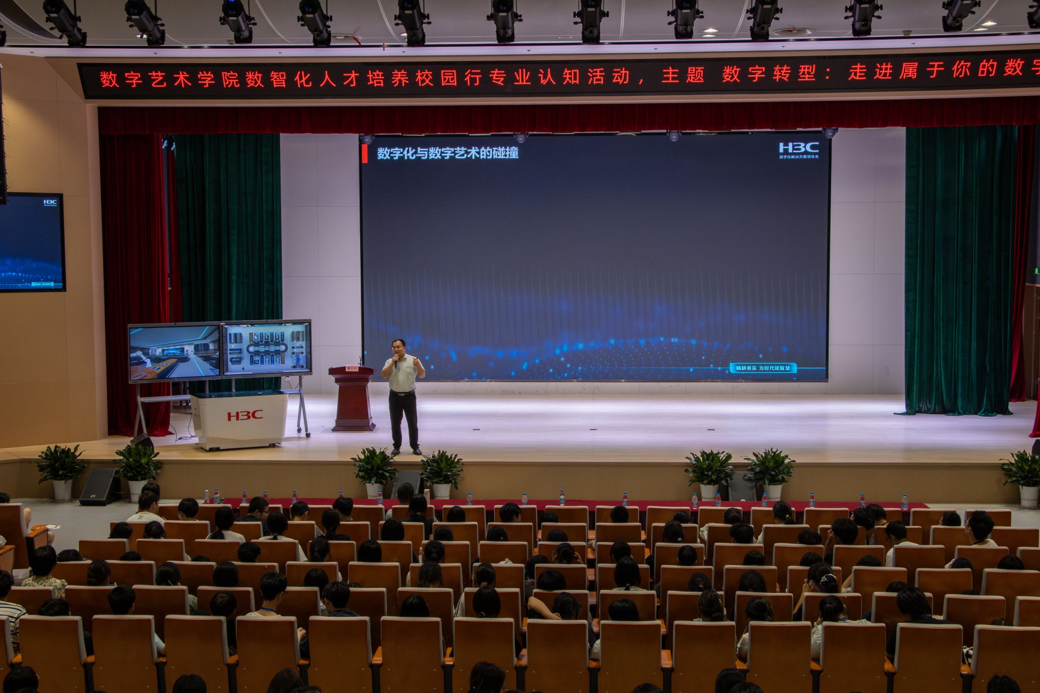 9月18日下午,我校数字艺术学院精心策划的“数智化人才培养校园行”专业认知活动首场讲座在闻道楼二楼报告厅成功举行。数字艺术学院院长章虹、副院长赵空、张道军以及学院800多名师生参加培训。本次活动由数字艺术学院与新华三集团全资子公司新华三工业互联网有限公司联合举办,作为“技能照亮前程”数智化人才培养校园行的重要一环,通过技术展示、案例讲解和现场互动,既讲透了数字化技术发展脉络,又讲活了数字化技术与艺术创作的融合创新,为数字艺术人才培养提供了新理念与新路径,是产教融合的又一次生动实践。