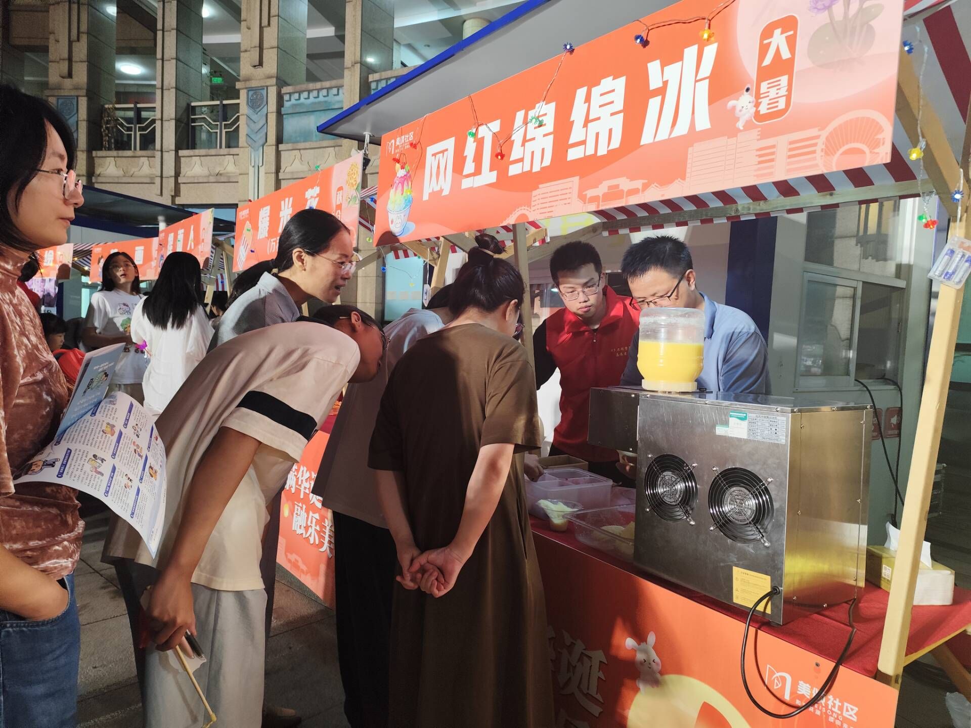 市集现场,特色美食区最受大家的欢迎。传统糖人摊位前,手艺人执勺轻晃,融化的糖浆在石板上流转,转眼便勾勒出嫦娥奔月、生肖等造型,志愿者们主动维持秩序,帮居民孩子们接过糖人,笑意盈盈。隔壁的棉花糖爆米花摊位飘出甜香,志愿者们则协助摊主宣传,向过往居民介绍特色,美食与大家的笑脸相映成趣,甜香与笑声交织成温馨乐章。