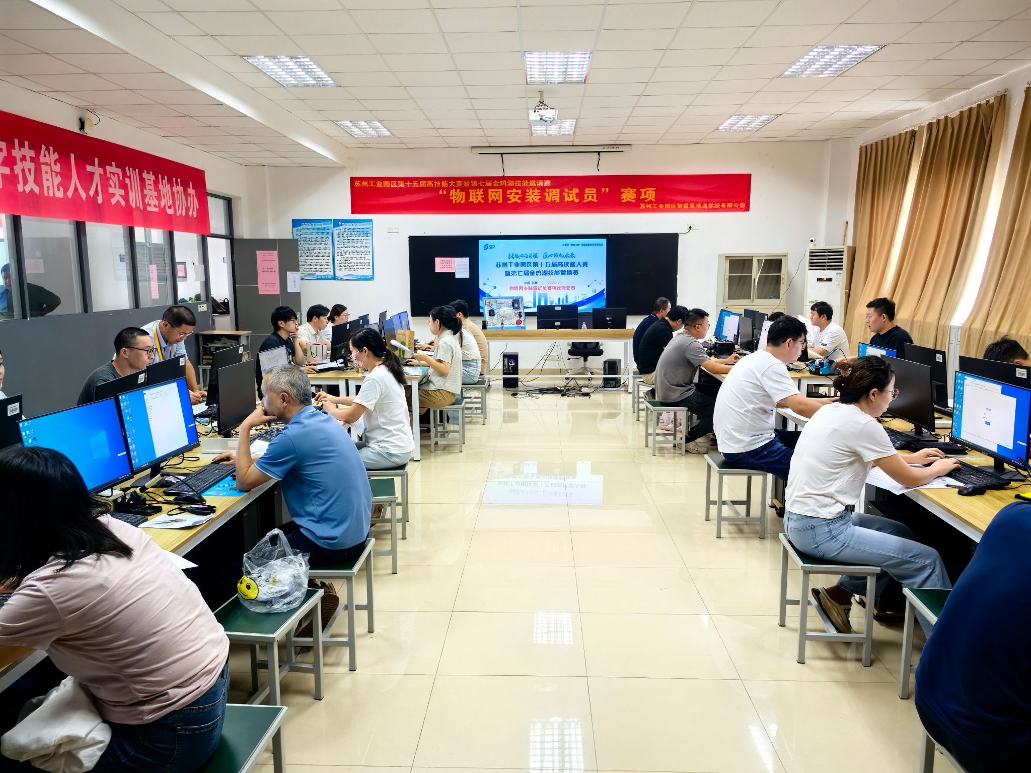 9月21日,苏州工业园区第十五届高技能大赛物联网安装调试员赛项在学校隆重举行。来自苏州各企业的 96 名技能高手齐聚赛场,通过理论考试与实操考核相结合的方式,全面展现物联网领域安装调试能力,尽显当代技能人才的卓越风采。