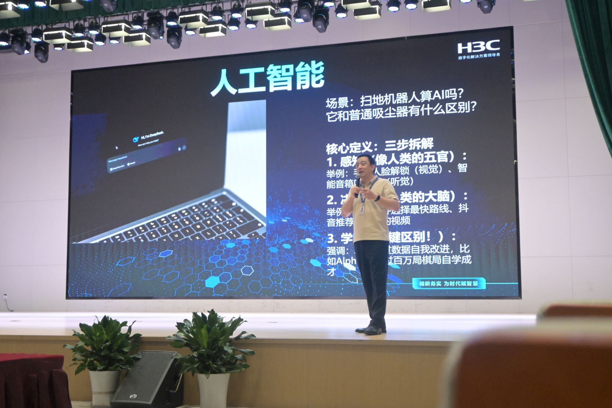 培训课程采用“互动引导+案例解析+技术科普”的模式。开场阶段,讲师通过“身边的数字化设备”互动提问与短视频展示,让学生直观感受“数字化转型已融入日常”——从手机支付到智能学习工具,从城市交通调度到校园智慧管理,数字化场景无处不在,迅速拉近学生与主题的距离。在核心知识讲解环节,讲师将数字化转型拆解为“工具电子化”“设备/平台智能化”“改变工作生活方式”三个阶段,结合新华三数字大脑在智慧城市、数字金融、工业互联网等领域的实践案例,让抽象概念具象化;同时聚焦数字化基础设施,以“高速公路(网络)、信息大脑(计算)、数据仓库(存储)”为类比,清晰解读交换机、服务器、云平台等核心组件的作用,并重点展开云计算、大数据、人工智能等核心技术的科普,用“网络超级电脑”“数据找趋势”“AI 对话修图”等通俗表述降低理解门槛。