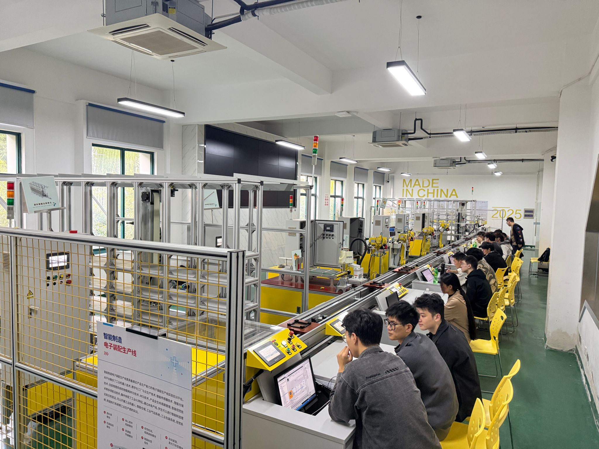 调研队伍的核心行程聚焦于苏大应用技术学院1.1万平米的产教融合大楼。在李东亚的引导下,一行人重点参观了教育部“互联网+中国制造2025”产教融合创新基地,主要包括示教编程实训室、虚拟仿真实训室、工艺实训工作站、柔性制造系统灌装产线、智能制造电子装配生产线、自动化工程设计、MES实验室、SCADA实验室等多个特色实验实训室。李东亚结合自身在智能制造领域的研究经验强调,“这些设备与生产一线较好地同步,学生实训即实战,毕业后能快速衔接企业需求”。这一观点与我校“能对接产业”的建设理念高度契合。