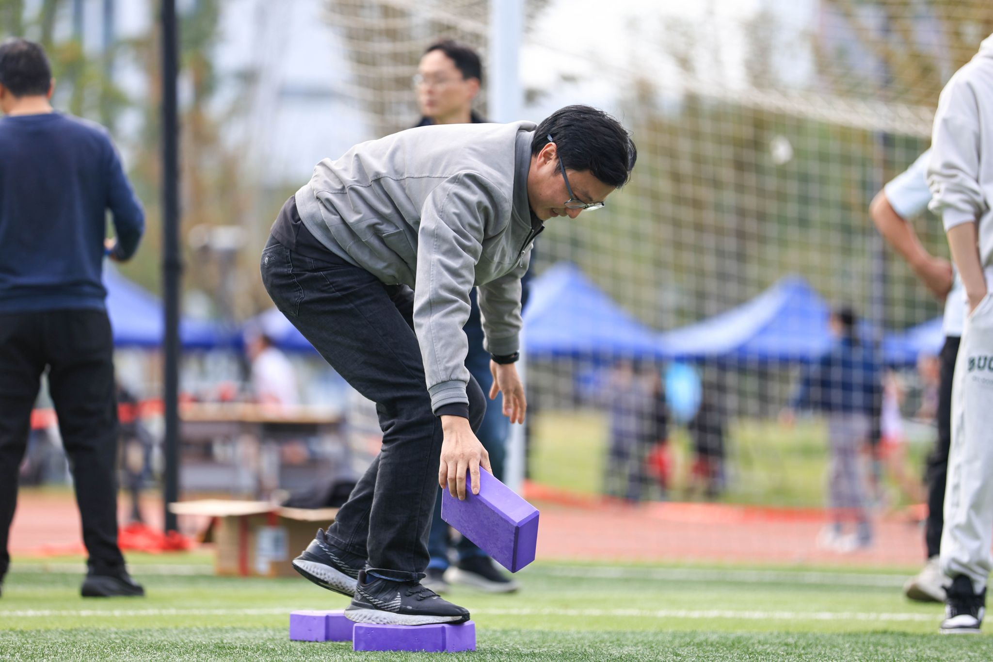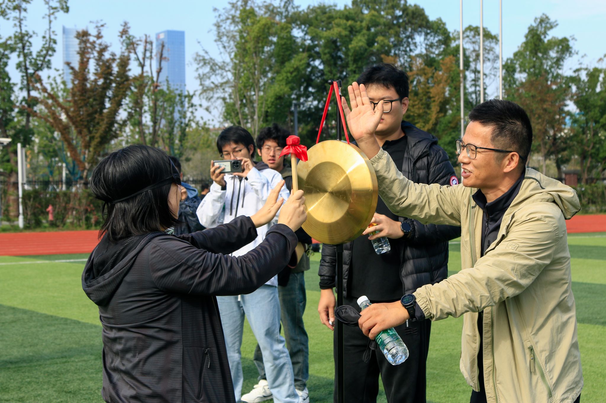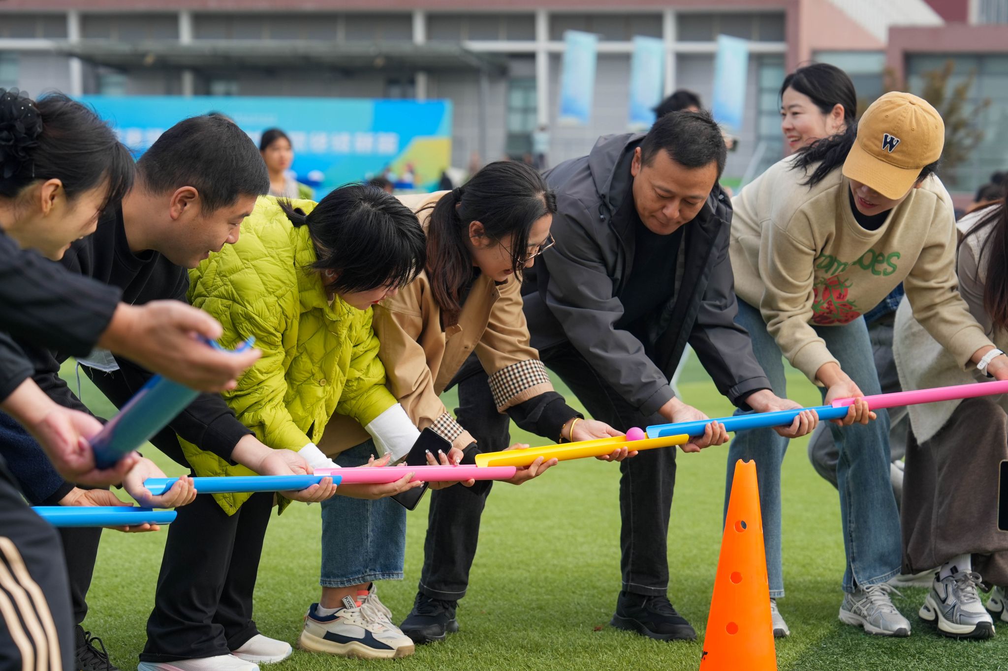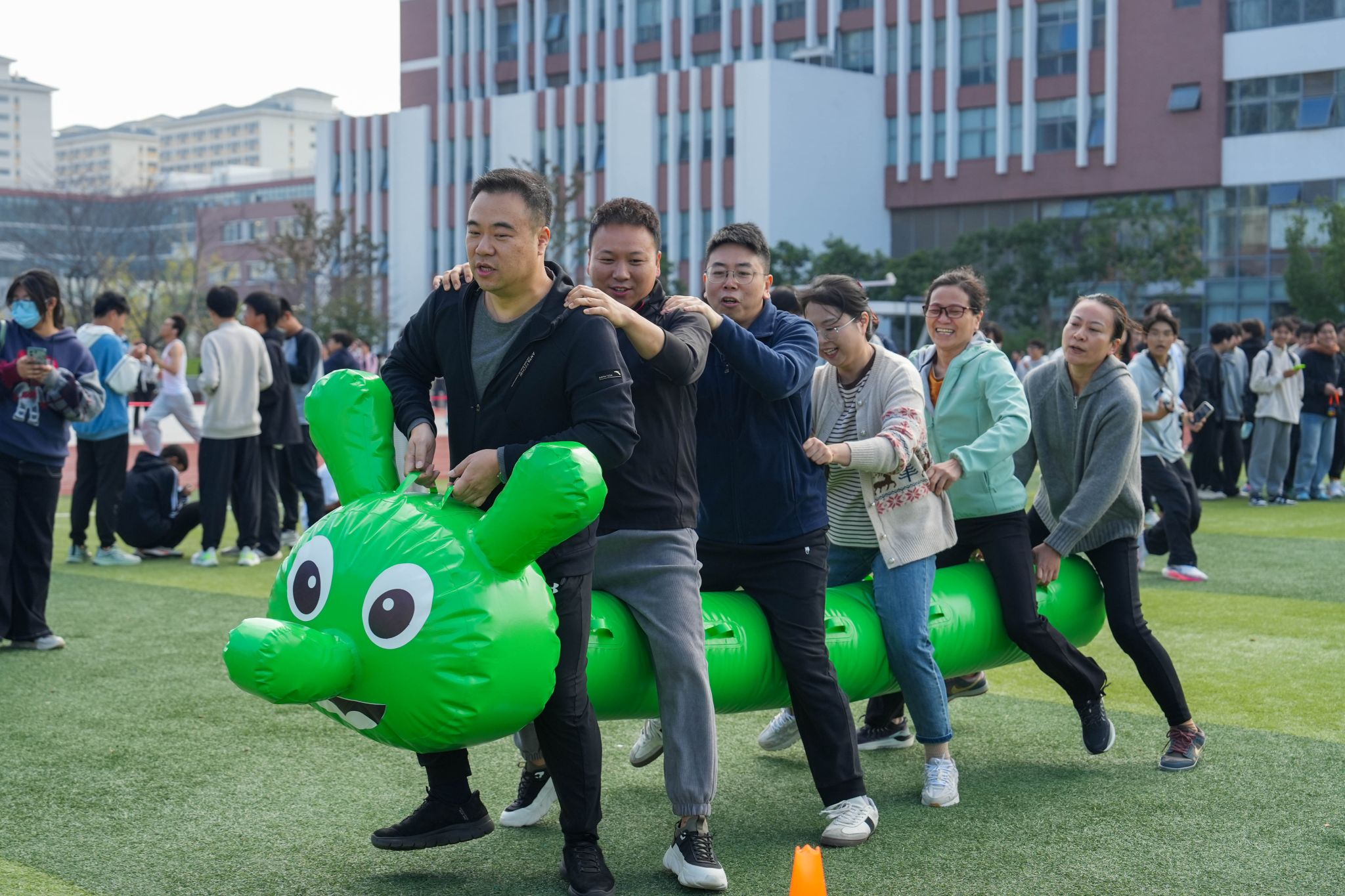 比赛现场热闹非凡,随着工会主席金志刚的发令,首场比赛拉开帷幕。“珠行万里”项目是对耐心和协作的终极考验,队员们手持U型槽,连接成一条长长的通道,让小球平稳地滚向终点,每一次小心翼翼地传递,每一次成功的衔接,都引得队友们欢呼。在“摸石头过河”的团队协作项目中,平日严谨教学的教师们变成“渡河高手”,在欢声笑语中展现出别样的活力与智慧。在欢乐毛毛虫项目中,参赛老师们跨坐在充气“毛毛虫”上,喊着整齐划一的口号,“一二、一二”地协力向前奔去,看似笨拙的“毛毛虫”在团队的默契配合下,变得灵活迅捷。“蒙眼敲锣”的互动游戏成为全场的最欢乐项目,参赛教师们化身“蒙眼侠”,在同伴的指挥下手持木槌,跌跌撞撞冲向目标,引发阵阵笑声与掌声。