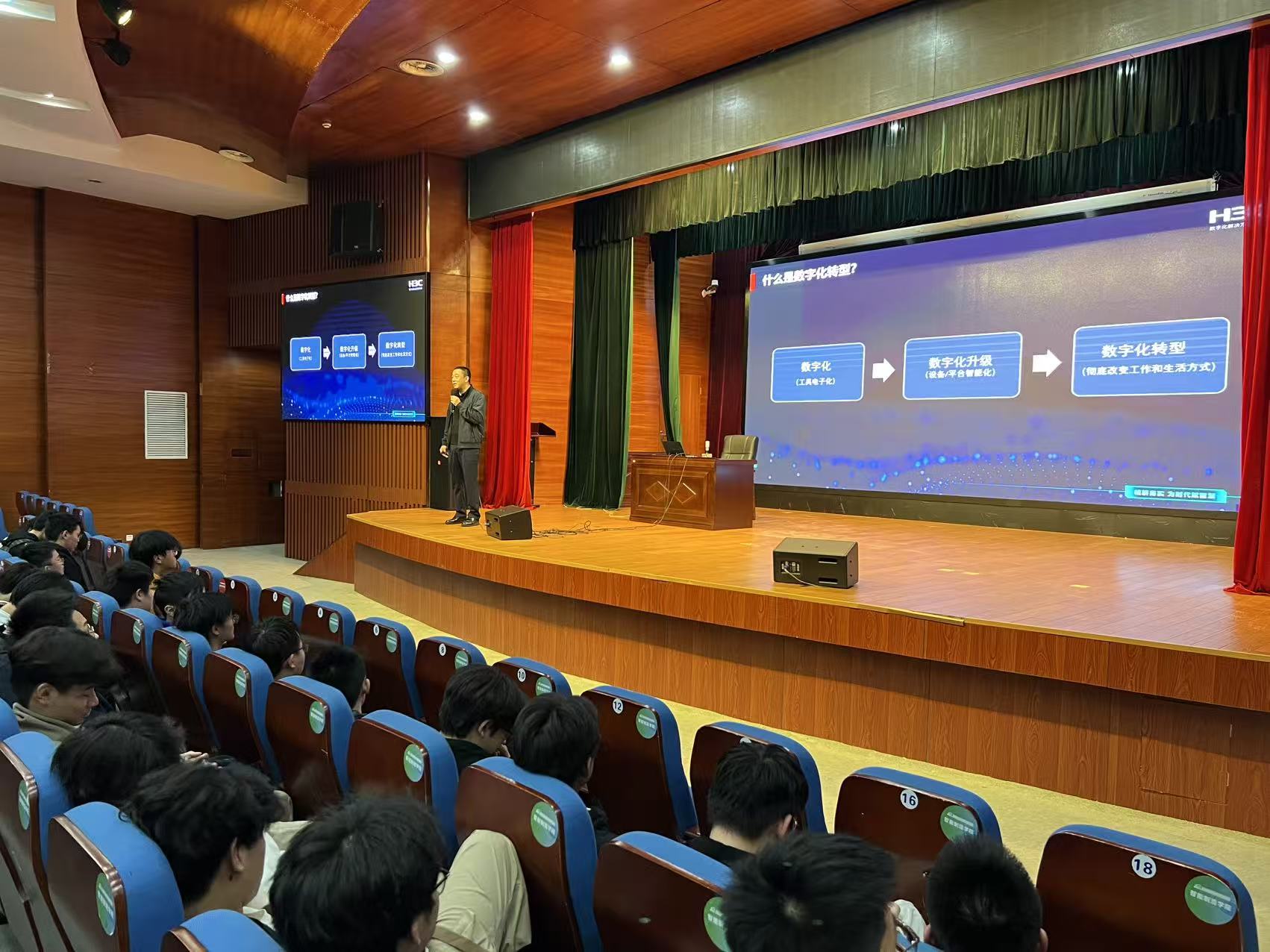 为了帮助学生把握数字经济发展脉搏,明确未来职业发展方向,智能制造学院于2025年11月6日下午在善仁楼影剧院举办“数字化转型:走进属于你的数字世界”专题讲座。本次活动特邀新华三集团高级系统工程师、项目经理、集团技术培训中心特聘讲师屠志丹担任主讲,学院24级、25级各专业班级的学生参加了讲座。