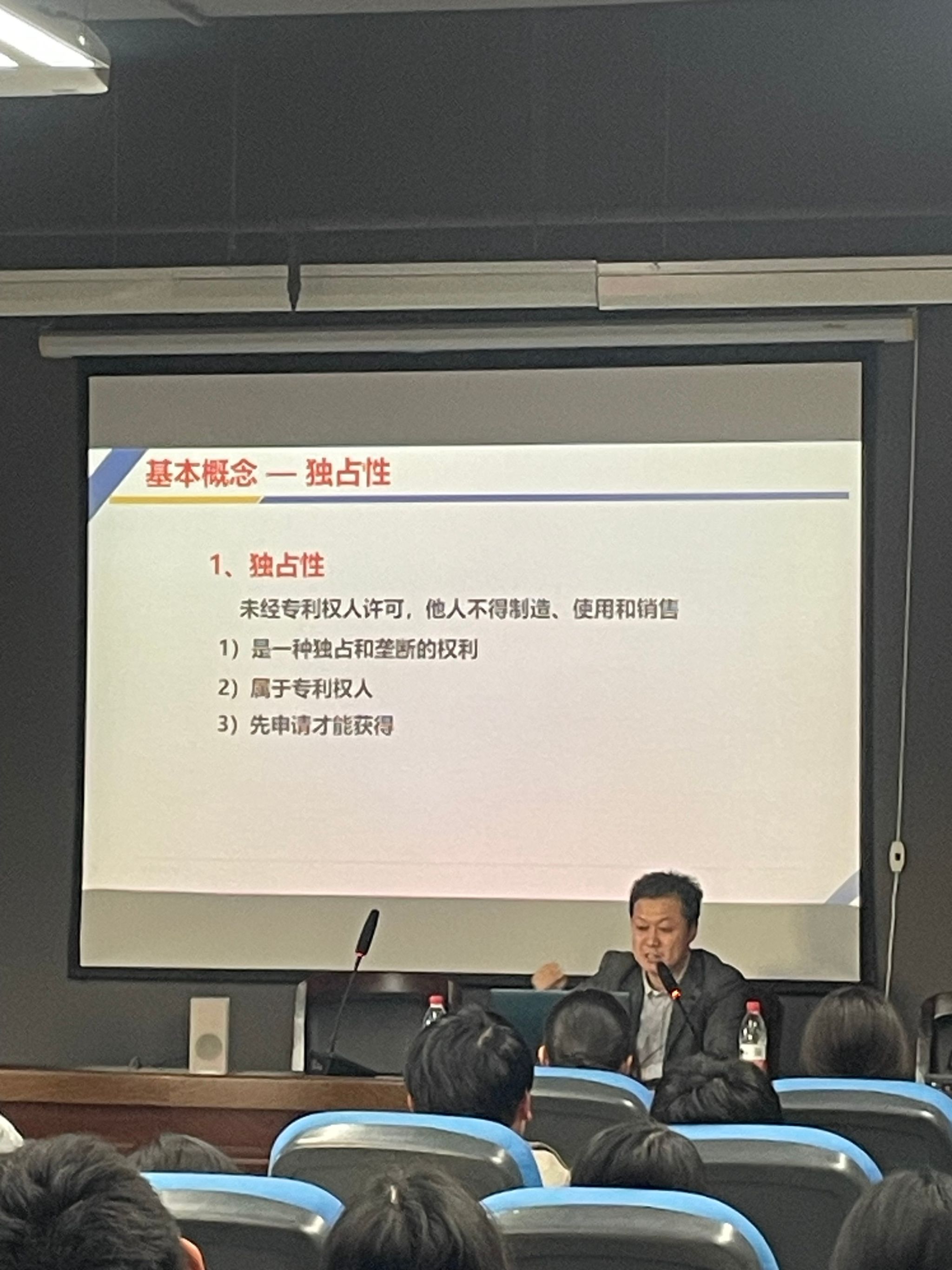 朱如松深耕知识产权领域,兼具多地实战经验与创业背景。他从知识产权的本质出发,系统讲解了专利的分类、特性及版权保护等基础知识,并结合大学生的创新特点,分享了多个贴近学生生活的案例。在讲座中,他坦诚分享了大学时期因缺乏知识产权意识,未能及时为插座改进创意申请专利的遗憾经历,以此提醒同学们“创意产生就要及时保护”。他还通过北京一名小学生改进雨衣设计并成功转让专利的案例,生动展现了“小创意”蕴含的“大价值”。
