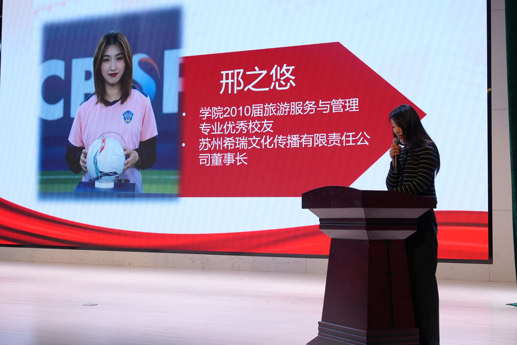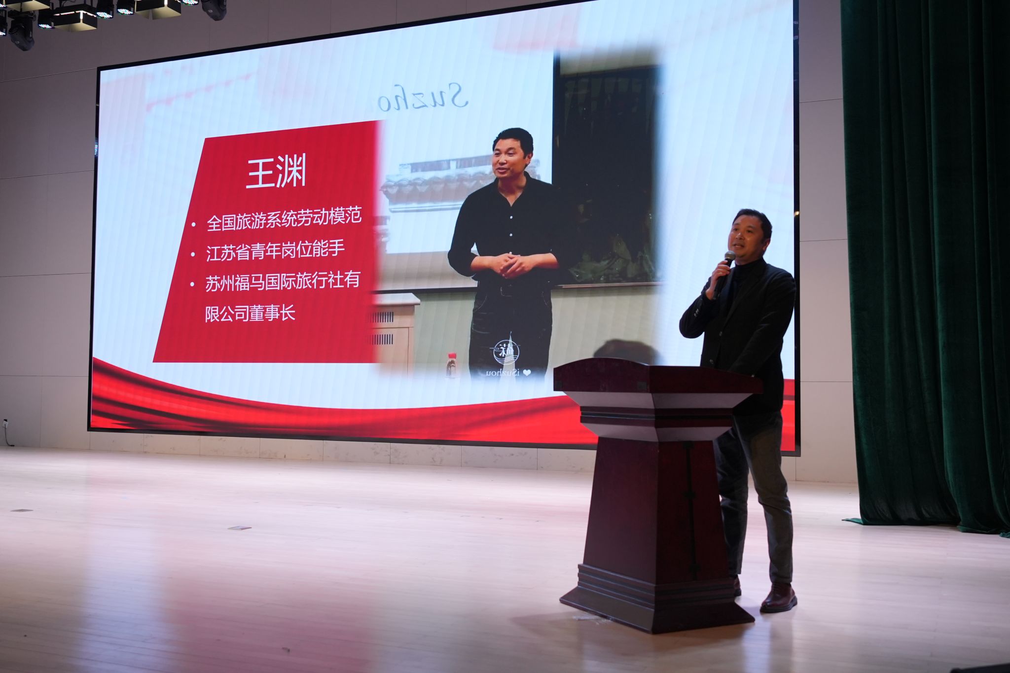 为深入学习贯彻关于弘扬劳模精神、劳动精神、工匠精神的重要论述,全面落实立德树人根本任务,构建“三全育人”工作格局,12月5日下午,商务管理学院在闻道楼二楼报告厅隆重举行“劳模匠心砺青春,榜样引领促成才”主题分享大会暨企业奖学金颁奖典礼。全国旅游系统劳动模范、江苏省青年岗位能手、苏州福马国际旅行社有限公司董事长王渊,学院优秀校友、苏州希瑞文化传播有限责任公司董事长邢之悠,国家二级心理咨询师周存芳等嘉宾应邀出席。学院全体师生及部分家长代表共同参与。活动通过榜样讲述、荣誉表彰、专题辅导与文艺展演相结合的形式,打造了一堂有深度、有温度、有力度的“大思政课”与“成长赋能课”。