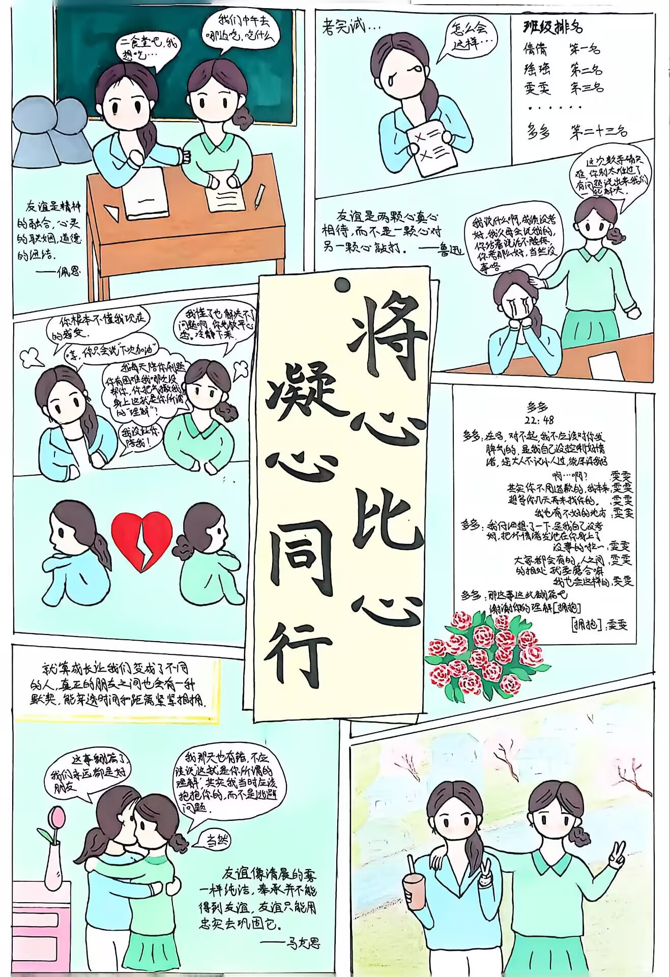 此次活动以艺术为桥,既为学生搭建了心理健康表达的创意平台,更以可视化的图文叙事传递了共情沟通、包容差异的交往智慧,实现了“以画润心、以美育人”的育人目标。未来,学校将持续深耕“善水润心”心育品牌,以常态化的心理漫画评比等活动为抓手,不断厚植理性平和、包容互助的校园心理文化土壤,助力每一位学子在健康和谐的人际互动中滋养心灵、逐光而行,成长为兼具共情能力与责任担当的时代新人。