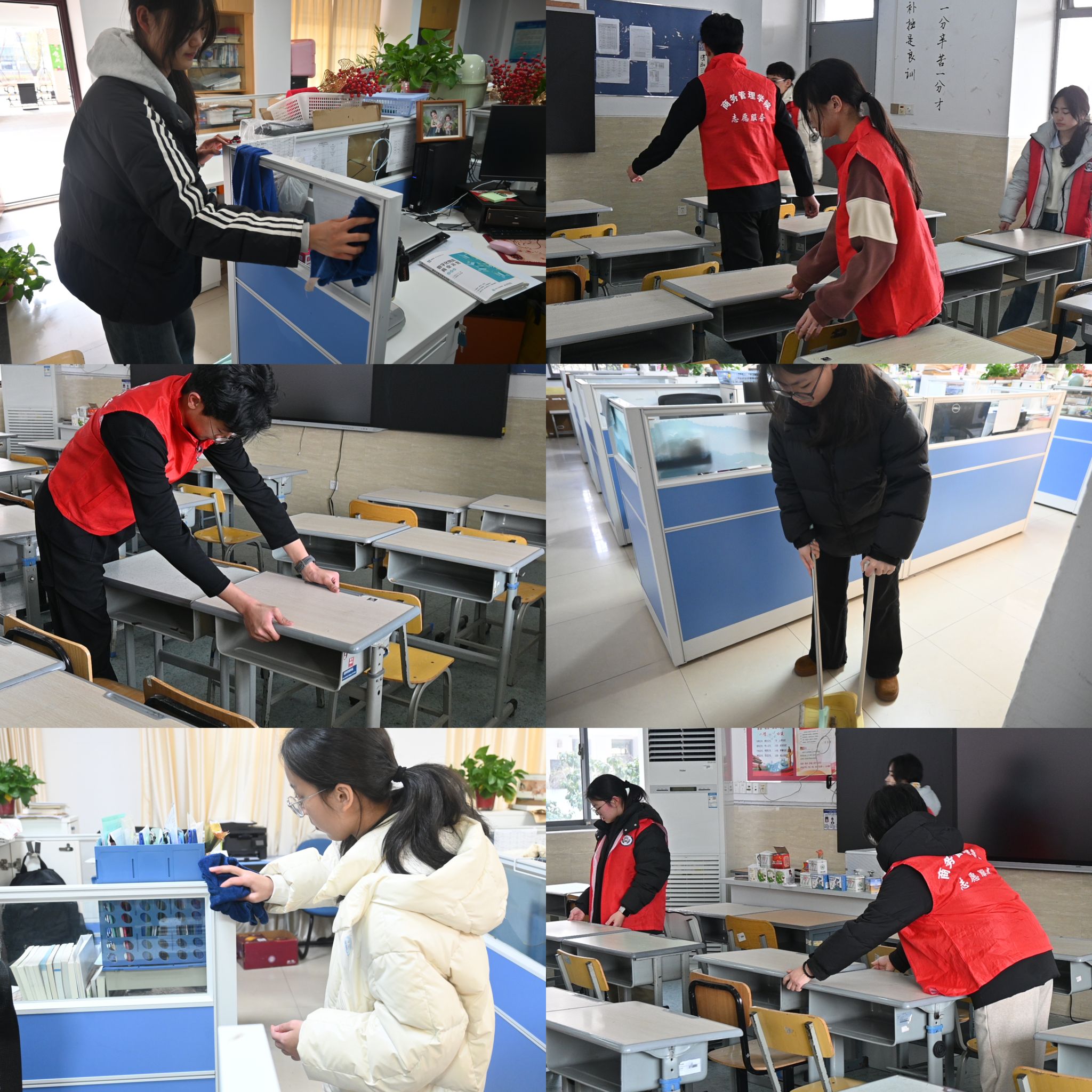 团总支还组织志愿者开展“文明礼仪志愿服务”行动。志愿者们分组错峰,走进各班,协助整理桌面、清扫地面、除尘清洁,细致入微,文明有序。每一次弯腰、每一次擦拭,都是对老师辛勤付出的默默回应。通过实实在在的劳动,同学们将尊师重道从口号变为行动,让办公室焕然一新,也让老师们感受到来自学生的温暖与敬意。