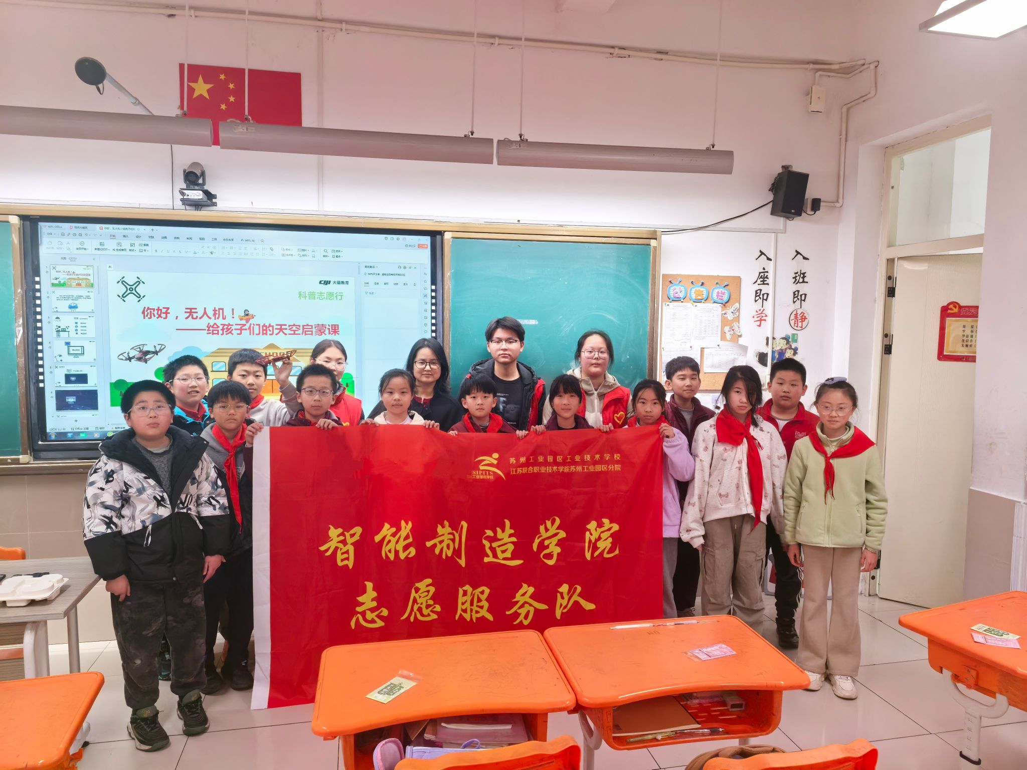 近日,智能制造学院王迅老师带领3名志愿者走进苏州工业园区星洲小学,开展以“科普志愿行”为主题的学雷锋志愿服务活动,为孩子们带来了一堂生动的无人机启蒙课。本次活动也是智能机器人与创客实践职业体验中心的系列实践活动之一。