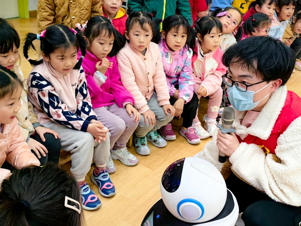 青年志愿者陶文轩同学将科普知识融入到有趣的问题中,用憨态可掬的机器人表演深深吸引了孩子们的目光,有的小朋友抑制不住自己的兴奋之情,在现场与机器人互动起来。赵裔同学通过图片和影片的展示讲解,让小朋友们初步了解了无人机的知识,在他的指导下,孩子们亲身操控小型无人机,感受了科技带来的快乐。整个活动中,小朋友们热情高涨,灿烂的笑容洋溢在每一位小朋友的脸上。