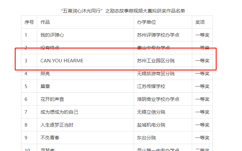 为培养广大学生理性平和、乐观向上的健康心态,激励学生做有理想、敢担当、能吃苦、肯奋斗的新时代好青年。根据联院的通知要求,学校高度重视,学生工作处积极准备,组织了励志故事微视频的评选活动,推选《CAN YOU HEAR ME》《以五育润心,扬青春风帆》《我的创业故事——街舞客》《以青春之名》《蜕变》五部作品参加苏州片区选拔,再由苏州片区推荐参加联院选拔,最终刘腾腾、陈小舟老师指导的《CAN YOU HEAR ME》作品获得了联院一等奖的成绩。