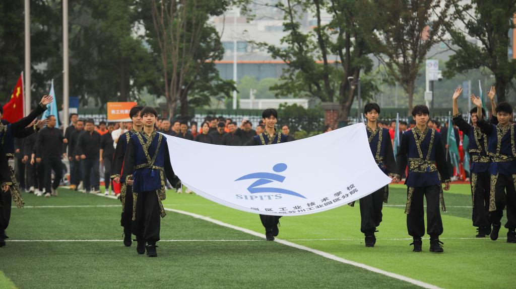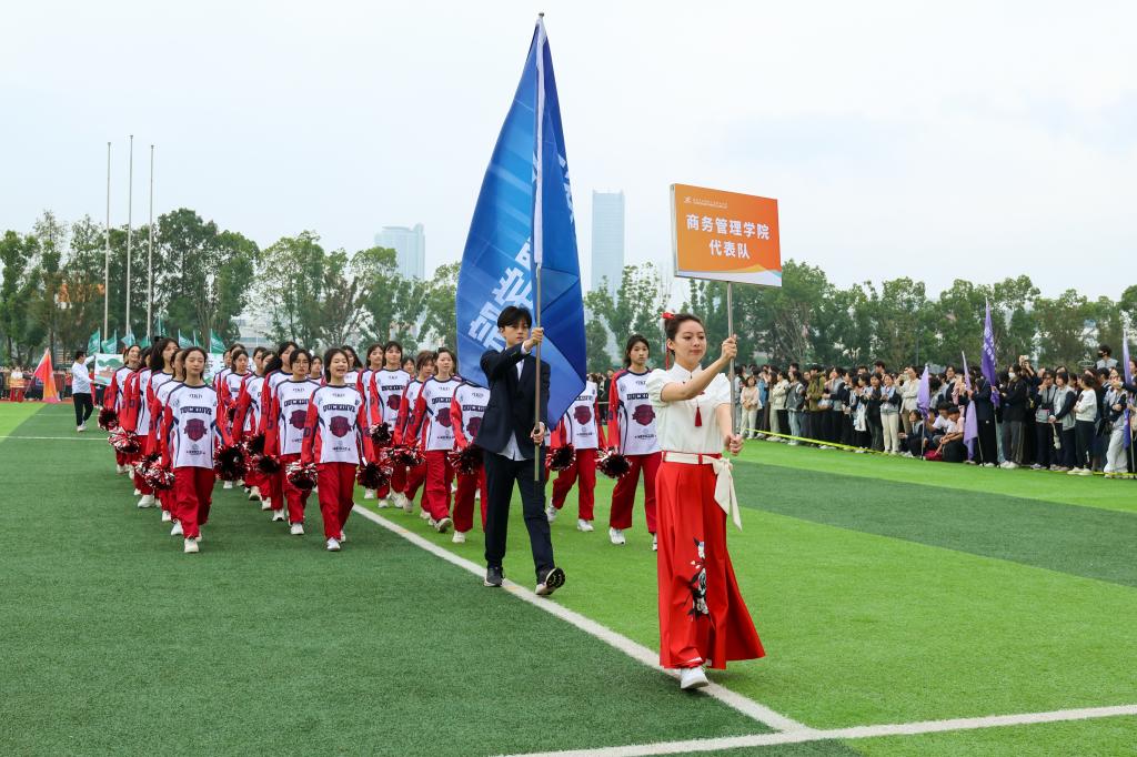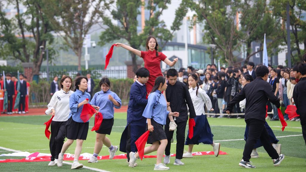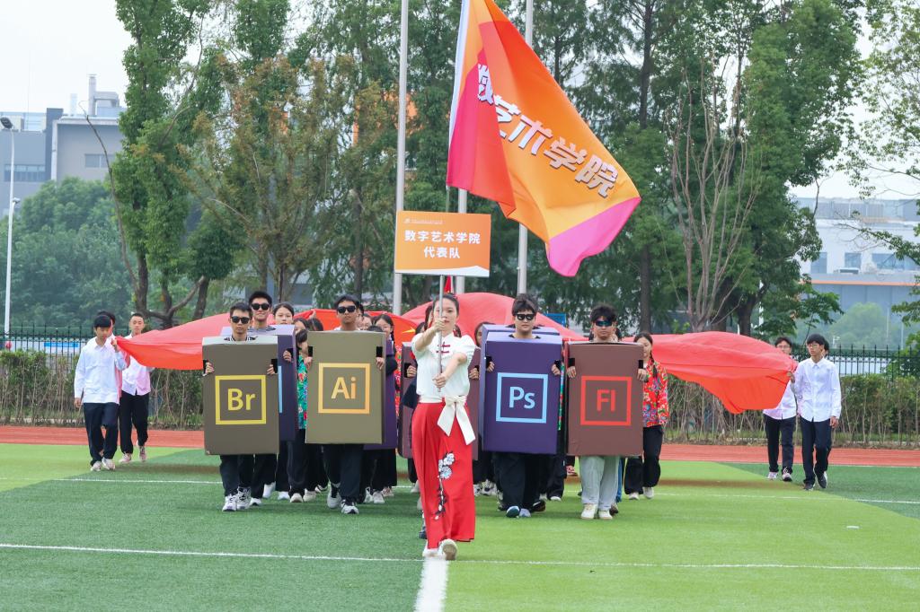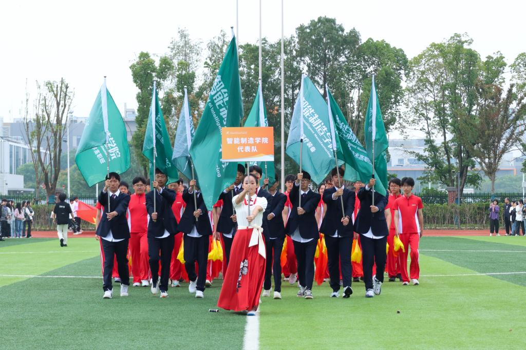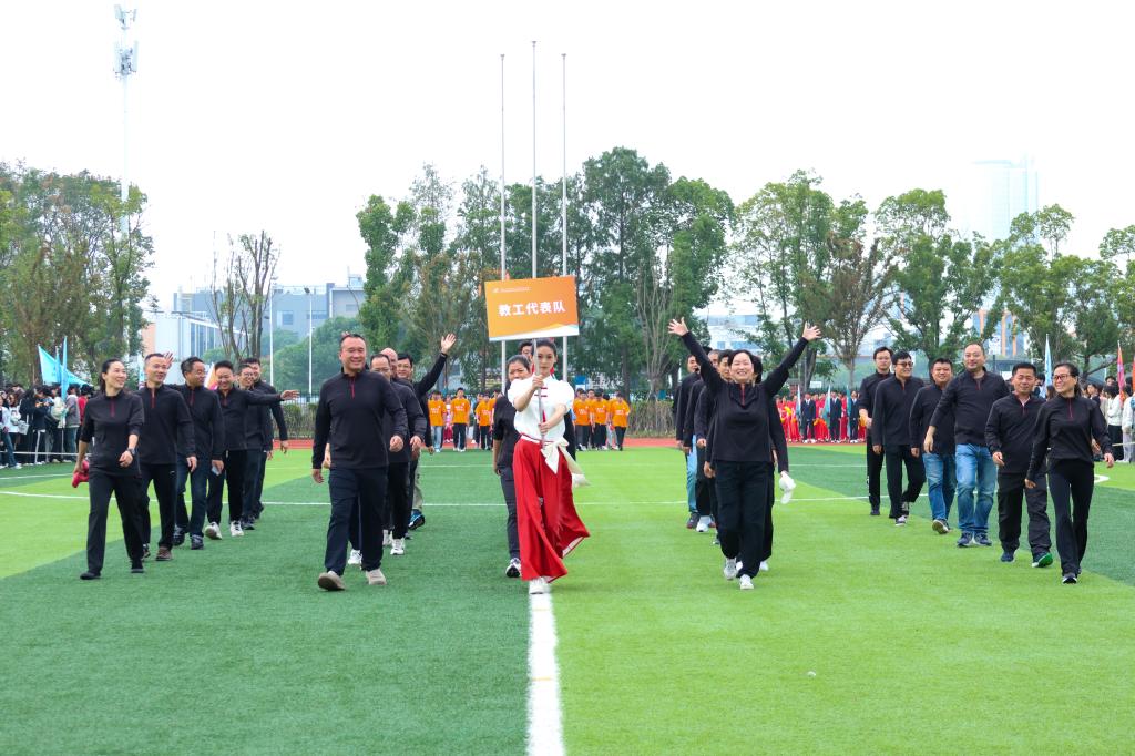 随后,教工代表队及四个学院代表队分别用各具特色的形式步入场地。他们步伐铿锵有力,特色表演热情洋溢,充分展现了新时代青少年的朝气与风貌。这些表演不仅展示了同学们的才艺,更体现了他们团结协作、勇于挑战的精神风貌。