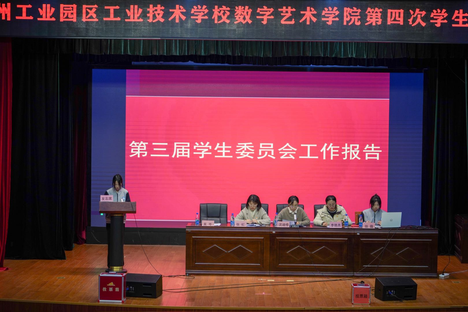 近日,苏州工业园区工业技术学校数字艺术学院第四次学生代表大会在善仁楼影剧院隆重召开。学院党支部委员沈迪修老师、李艳燕老师、团总支书记张虹老师出席会议。来自全院各班级的146名学生代表,肩负着全院青年学生的信任与嘱托,齐聚一堂,共同行使民主权利,参与学院民主建设。