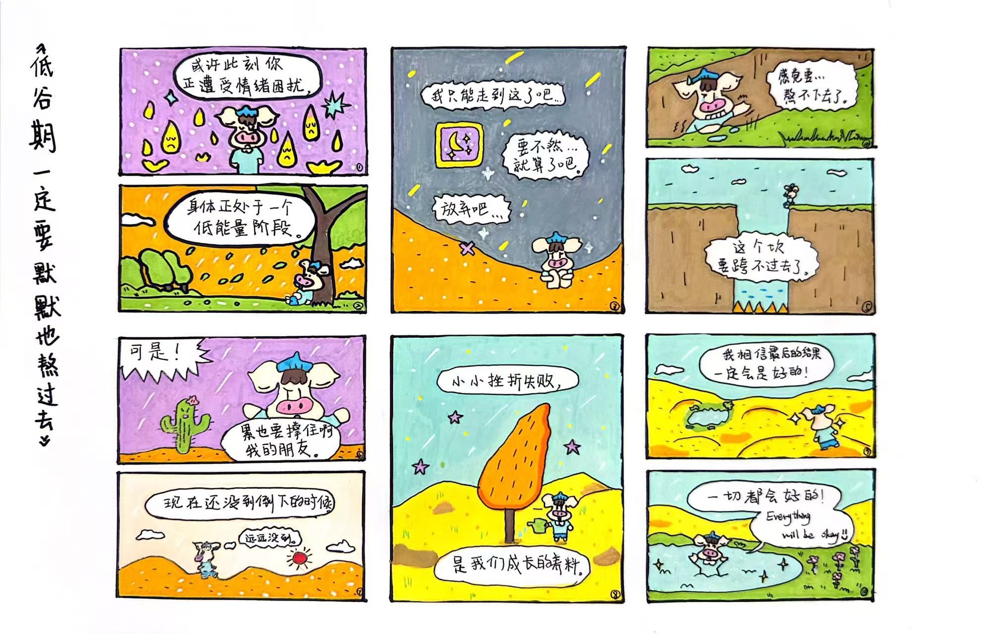 创意简介:以小猪为形象,用分镜展现其从情绪困扰、想放弃到坚信美好、积极振作的过程,传递低谷中坚守的正能量。