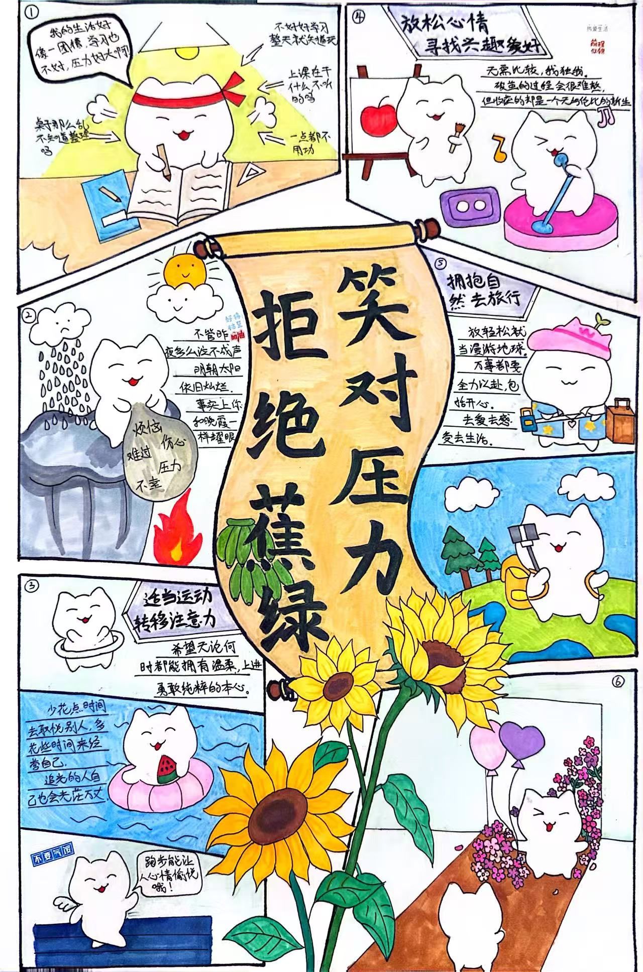 创意简述:本张作品通过寻找兴趣爱好,适当运动,拥抱自然等三个方面来呈现出笑对压力的方法,表达了我们要向阳而生拒绝焦虑。