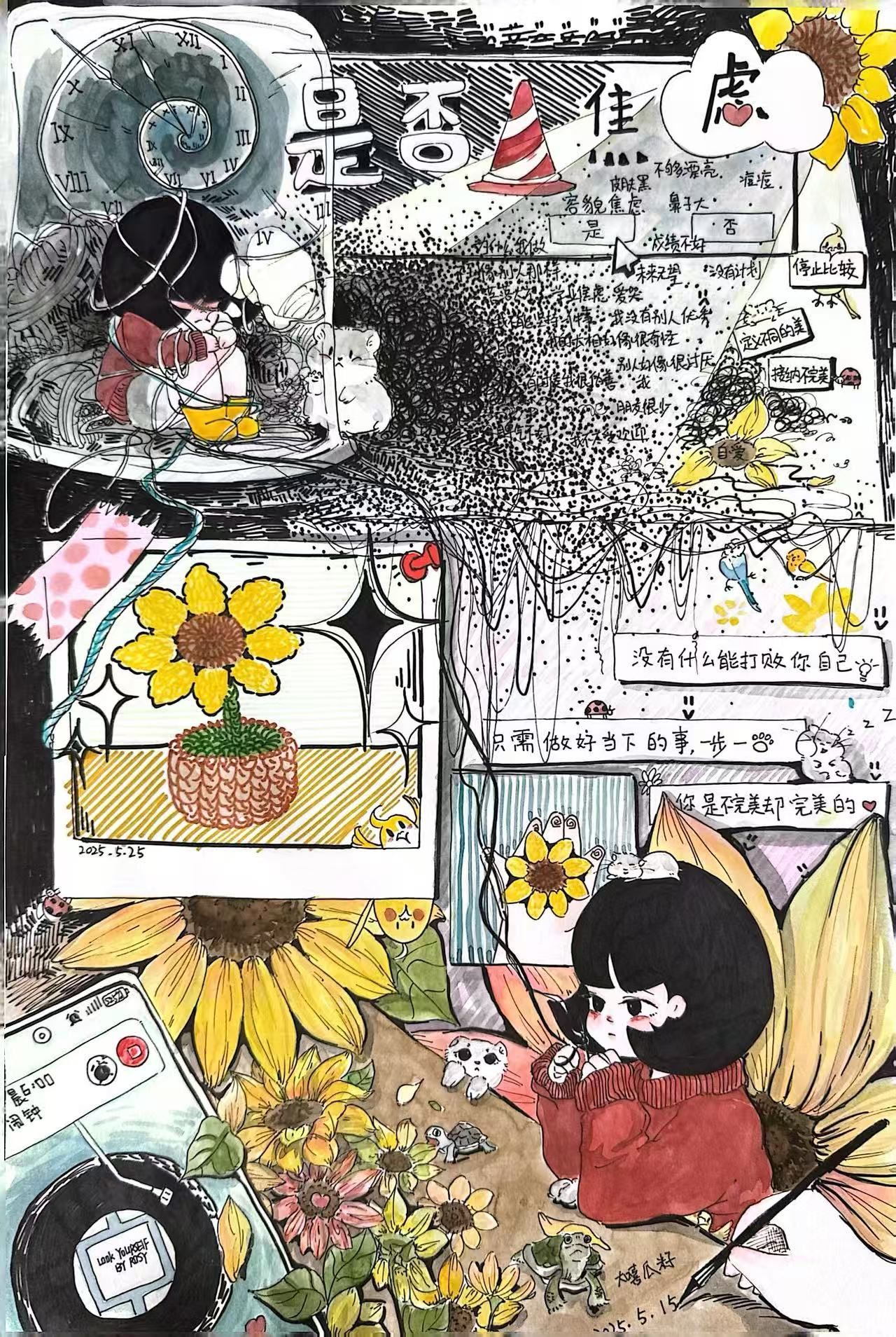 创意简述:小小的我有着小小的勇气,焦虑时时间一分一秒逼迫着我很多事都成了一堆乱麻,但到最后我还是会冷静下来一件一件做,我在生活中有各种各样的不足和焦虑,但这就是不完美却完美的我,我很满意这样的我。