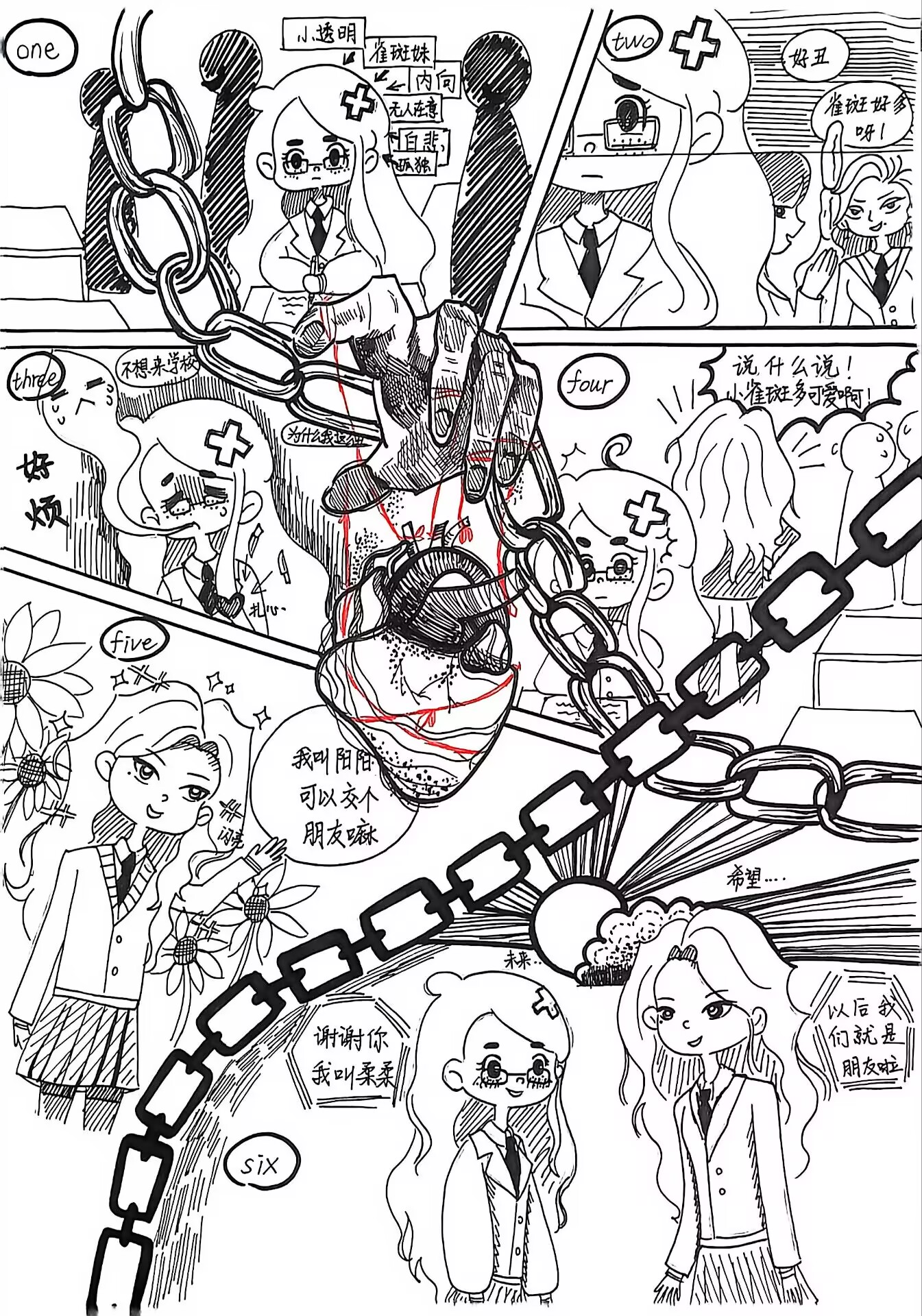 心理漫画设计大赛聚焦“人际交往”主题,面向全体学生征集以校园生活、交往困惑、冲突化解为核心素材的原创漫画作品。活动鼓励以多宫格形式,运用夸张、隐喻、拟人化等艺术手法,将人际沟通技巧、冲突处理方法、包容理解理念转化为可视化图文叙事。优秀作品将通过学校“水润青年”微信公众号系列推送,以漫画故事传递交往技巧与冲突应对策略,引导学生接纳差异、学会包容,在图文共鸣中培育积极交往心态,营造理性平和、包容互助的校园心理文化氛围。