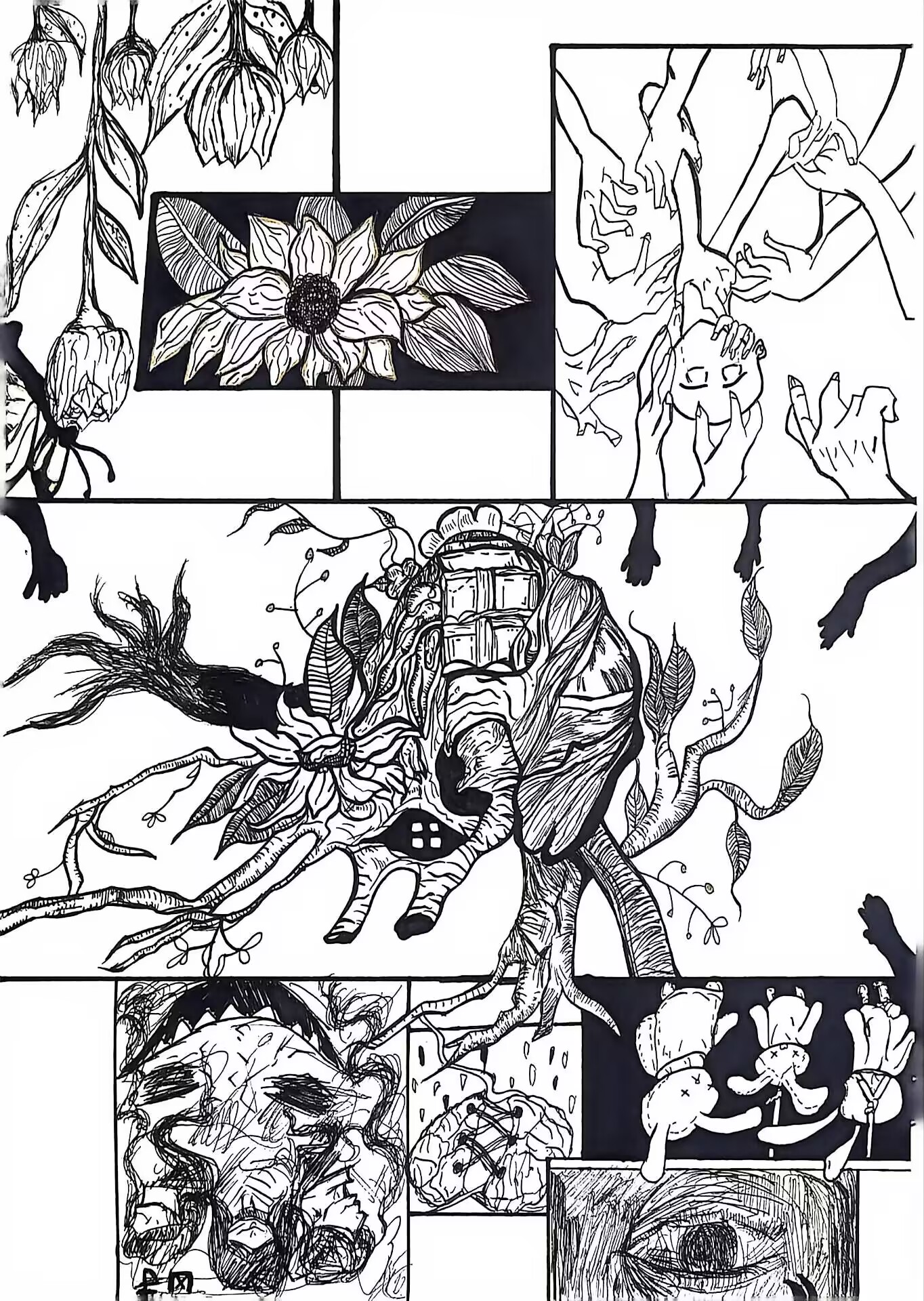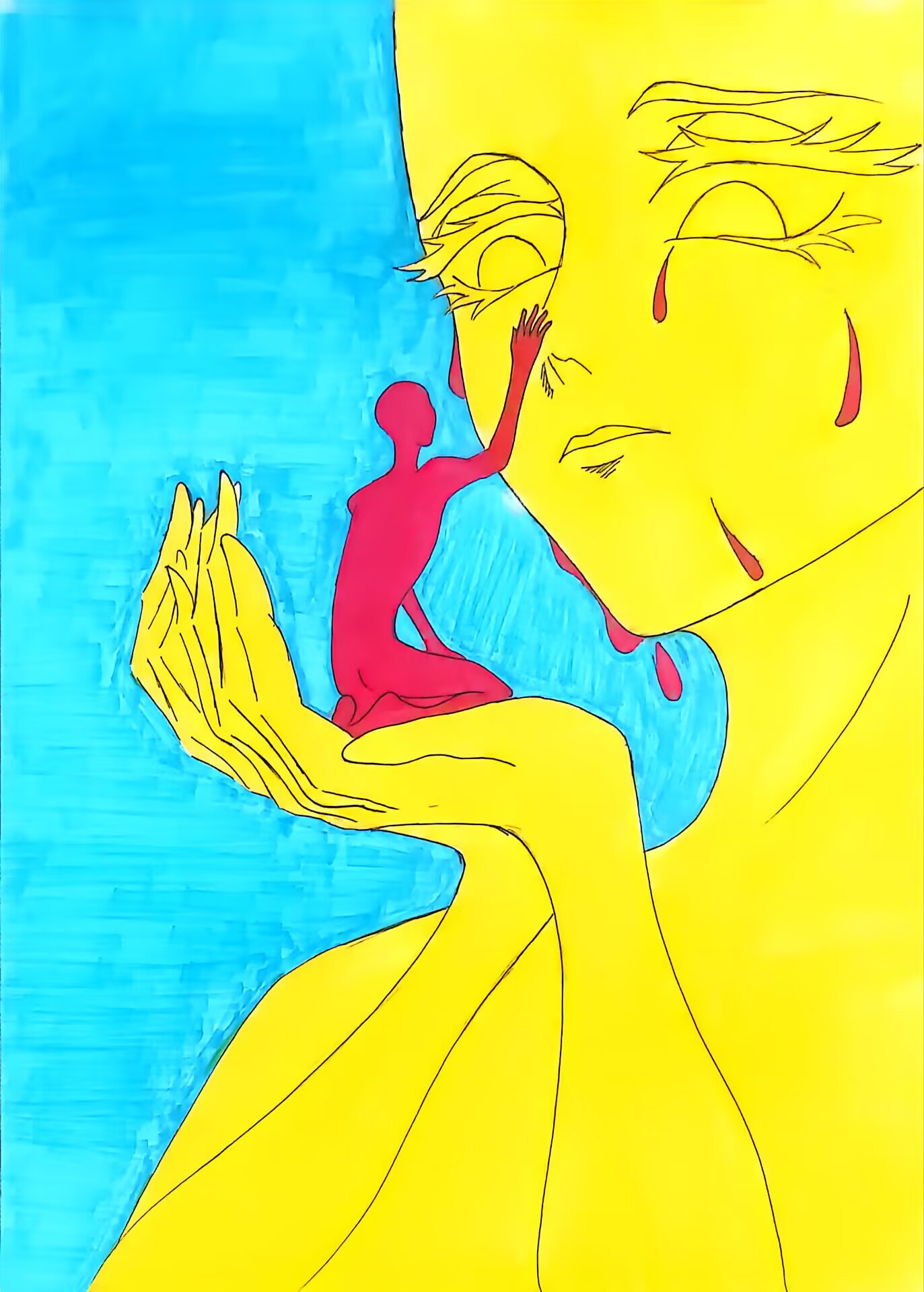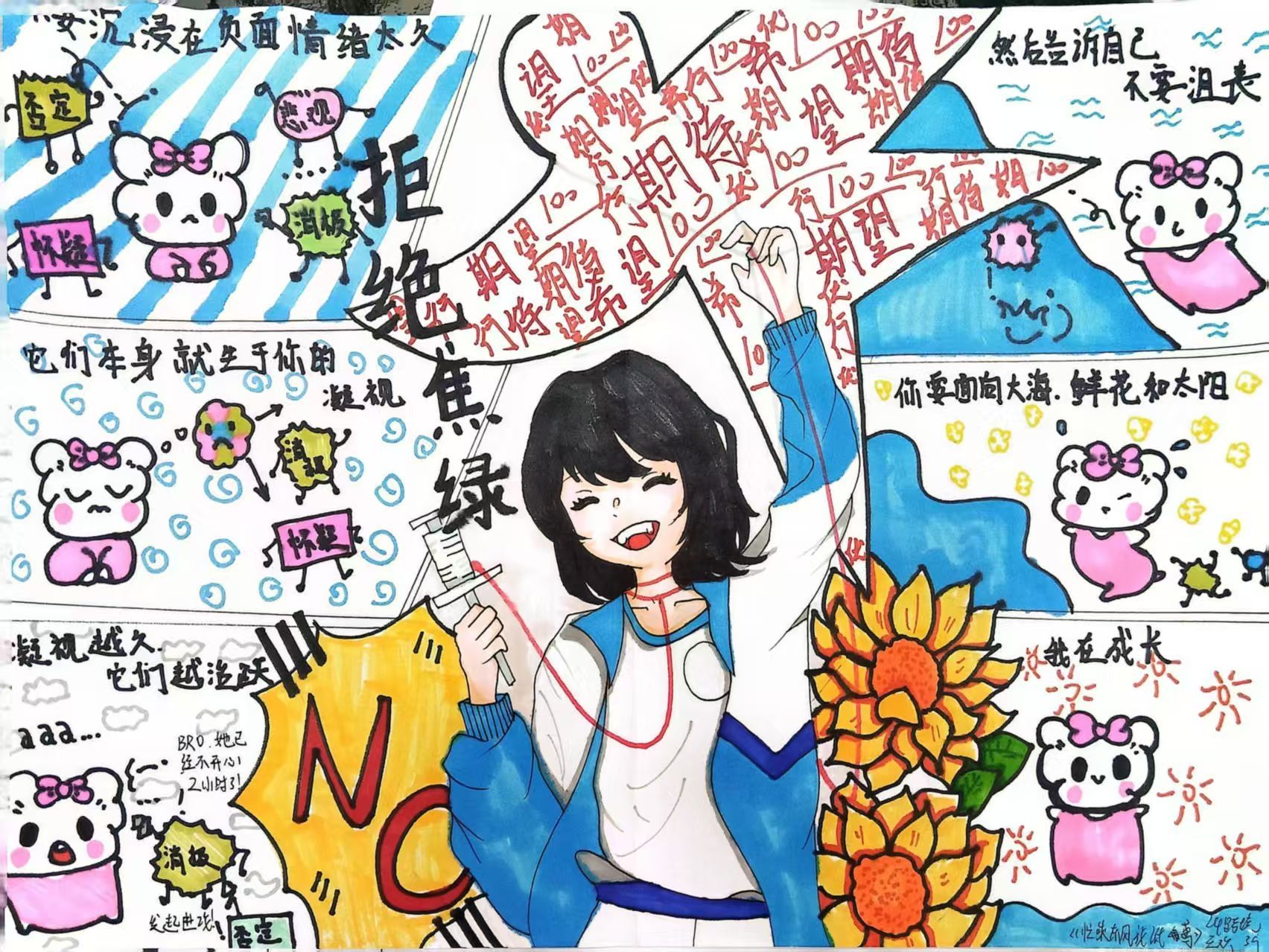 创意简述:通过描绘被束缚的人类与向日葵的绽放形成对比,鼓舞学生绽放内心的花朵,积极阳光面对困境。