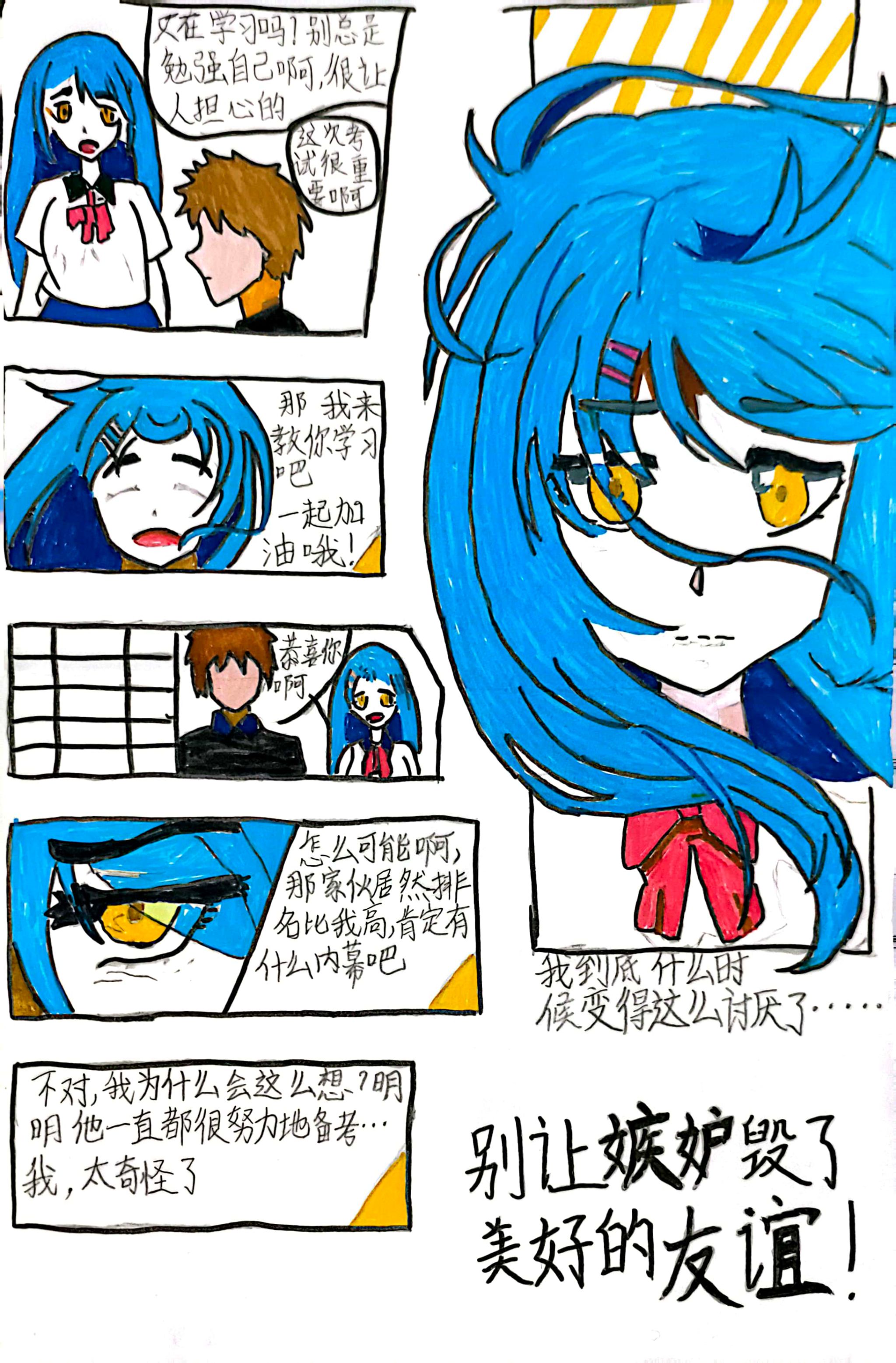 创意简述:蓝发少女助友备考,妒念生后自省护友谊。