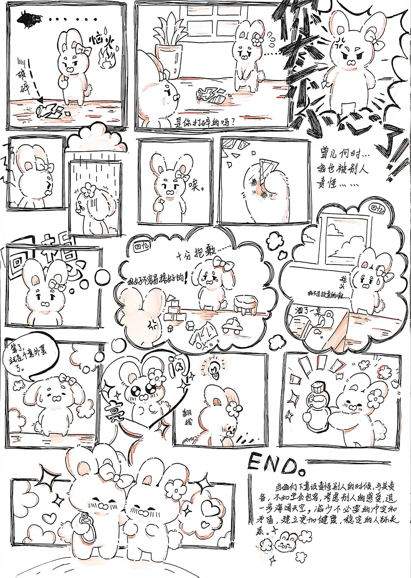 创意简述:作品以两只小兔子的故事,讲述学会包容的重要性。当我们下意识责备别人的时候,与其责备,不如学会包容。忍一时风平浪静,退一步海阔天空,代入他人视角思考,理解他人心情。减少不必要的冲突矛盾,建立更加健康,稳定的人际关系!