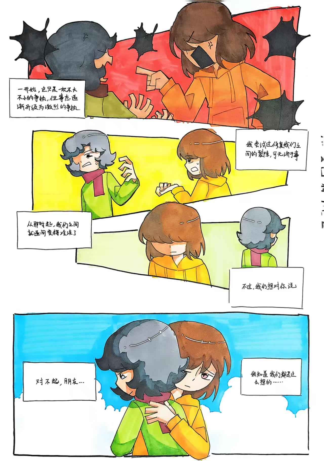 创意简述:作品主要阐述了朋友之间有关于争执过后的愧疚,从“冷战”,再到互相原谅与和解的过程。