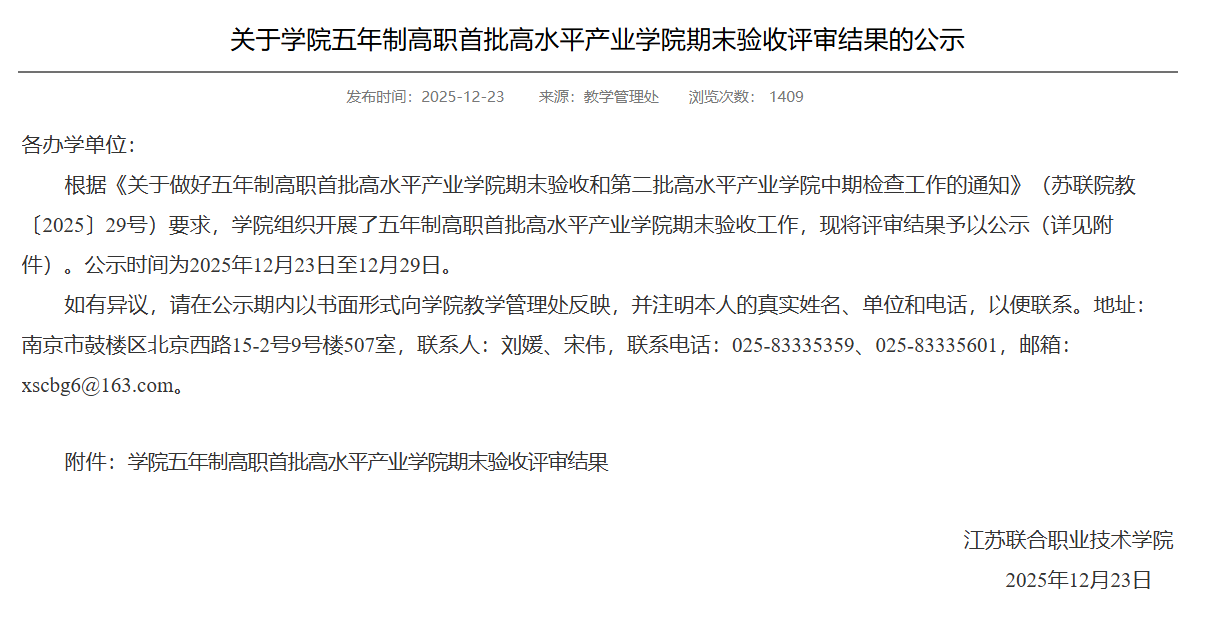 近日,江苏联合职业技术学院五年制高职首批高水平产业学院期末验收评审结果正式公布。我校五年制高职智能制造产业学院期末检验评审顺利通过,获评“优秀”等级,充分展现了学校产教融合、校企协同建设发展的扎实成效与鲜明特色。