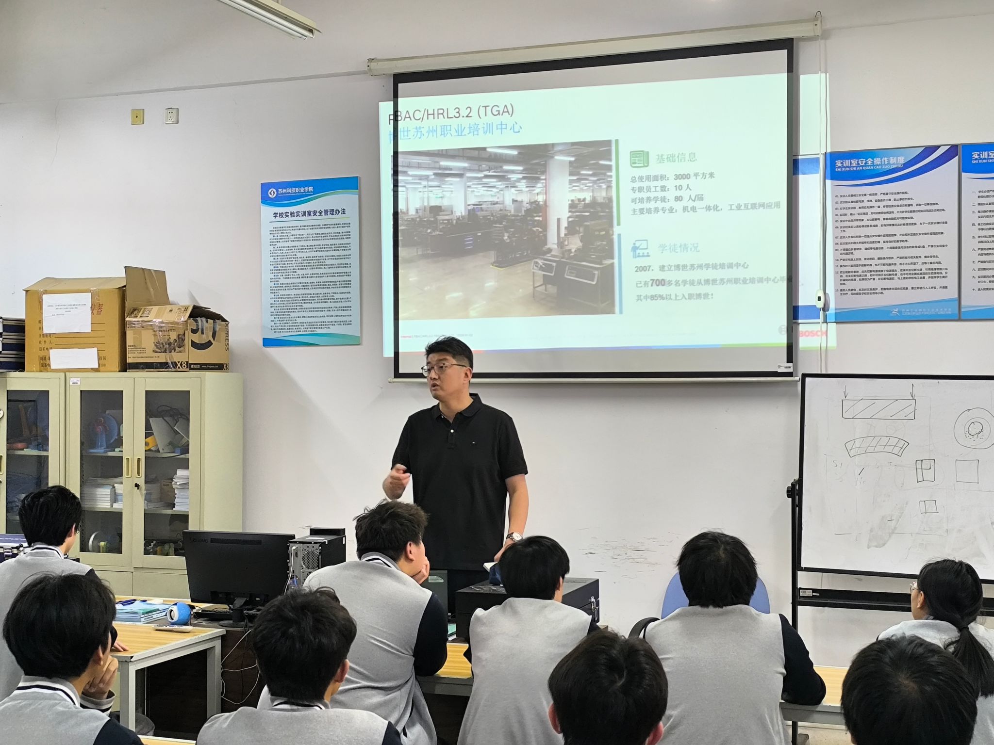 近日,博世汽车部件(苏州)有限公司(以下简称:博世)宣讲会在我校善能楼206圆满举行。博世苏州职业培训中心高级项目工程师刘锡宏、智能制造学院副院长成晨、班主任耿仁贤和2022级机电一体化技术高职班同学们共同参加了本次宣讲会。本次活动由机电一体化技术专业负责人陈慧斌主持。